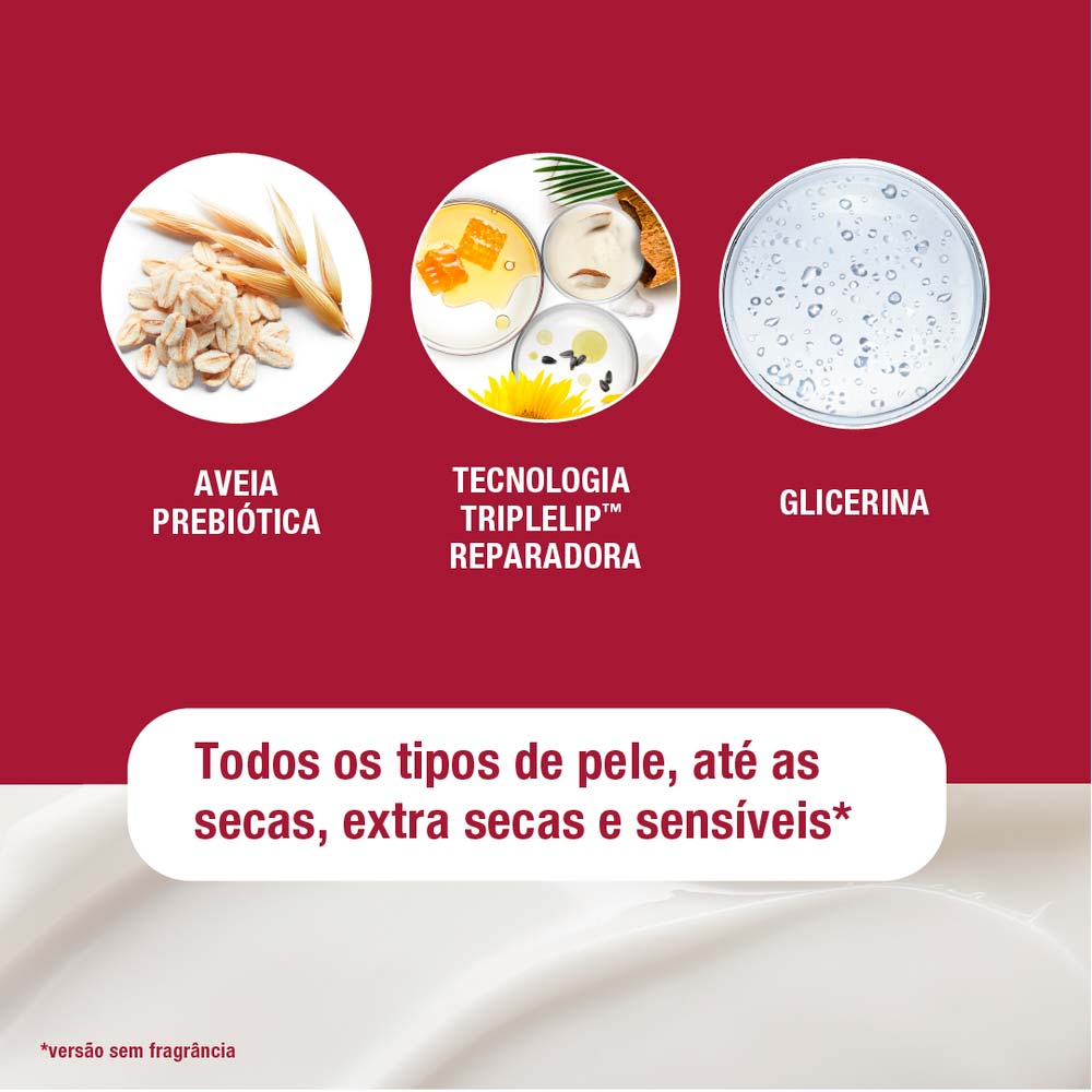 O que é e para o que serve? Loção Intensiva Corporal Hidratante, possui fórmula não oleosa e de rápida absorção. Com glicerina e aveia probiótica, hidrata profundamente formando uma camada protetora que repara a barreira cutânea e reequilibra a microbiota da pele. Promove hidratação imediata e prolongada, minimizando o aspecto esbranquiçado e descamação causados pelo ressecamento excessivo. Benefícios e diferenciais: -Fórmula avançada com Aveia Prebiótica e Glicerina -Tecnologia TRIPLELIP™ Reparadora: forma uma camada protetora que repara a barreira cutânea -48 horas de hidratação: hidrata de forma imediata e prolongada -Desenvolvido e recomendado por dermatologistas -Fórmula não oleosa e de rápida absorção -Respeita o pH natural da pele -Hipoalergênico -Indicado para a hidratação de todos os tipos de pele, até as mais secas, extras secas e sensíveis -Dermatologicamente testado -Para uso diário Como Usar: Espalhe a loção intensiva corporal hidratante por todo o corpo massageando suavemente até que seja absorvida pela pele. Dar especial atenção às áreas mais ressecadas como pernas, cotovelos e pés. Precauções: Uso externo. Não ingerir. Conservar fora do alcance das crianças, em local seco e fresco. Em caso de contato acidental com os olhos, enxaguar abundantemente. Havendo irritação ou alergia, suspenda o uso e procure por orientação médica.