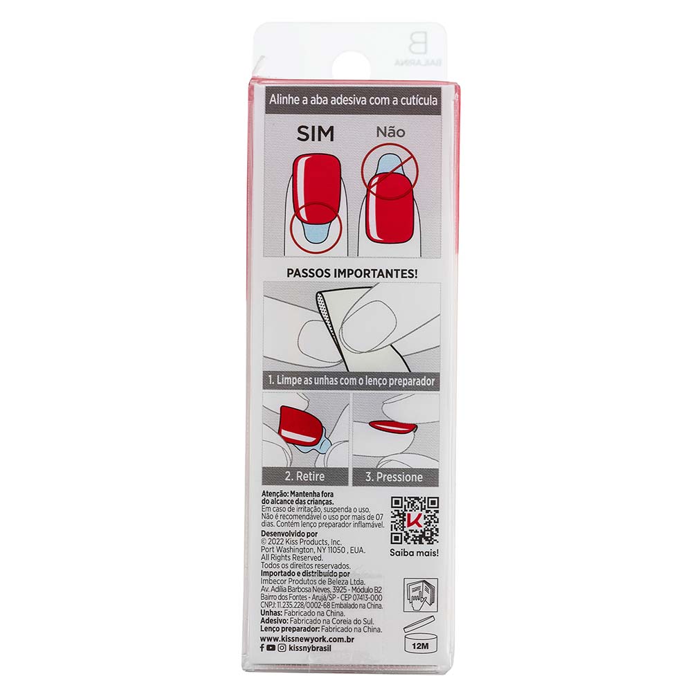 As Unhas Postiças Autocolantes imPRESSsão a melhor opção para você que busca resultado de salão em casa. Com tecnologia Super Hold, a dupla camada de adesivo é a responsável por garantir unhas perfeitas por até 7 dias, sem danificar suas unhas naturais. A coleção imPRESS Color traz 14 novos modelos que são uma verdadeira explosão de cores modernas e vibrantes. Todos os modelos têm o diferencial da tecnologia Pure Fit, que conta com cutículas afiladas e pontas 14% mais finas e resistentes que proporcionam um encaixe perfeito, além de um acabamento muito mais natural. Esse lançamento também traz 50% menos plástico e uma embalagem 100% reciclável com imPRESS feita a partir de tinta de soja, recurso renovável e ecológico. Cada caixinha de imPRESS Color contém 30 unhas com 12 tamanhos diferentes para possibilitar mais de uma aplicação, além de um kit completo com lencinho preparador, lixa e palito de unha. Depois que você conhecer a praticidade e beleza das unhas imPRESS, nunca mais vai querer ficar esperando o esmalte secar! Características - Adesivo com tecnologia Super Hold - Design com tecnologia Pure Fit, com pontas 14% mais finas e resistentes - Sem tempo de secagem - Aplicação fácil e rápida - Cores vibrantes e intensas que dispensam o tempo de secagem - Não danifica as unhas naturais - Não lasca e não borra - Acabamento ultra gel brilho - À prova d’água - Dura até 7 dias - Embalagem 100% reciclável - imPRESS da embalagem feita com tinta vegetal - Produto vegano não testado em animais Modo de Usar: Abra a embalagem e comece selecionando os tamanhos ideais para as suas unhas naturais - caso esteja em dúvida, opte pela opção de menor tamanho. Em seguida, utilize o lenço preparatório incluso na embalagem para limpar resíduos e garantir uma melhor aderência. Para iniciar a aplicação, alinhe a aba adesiva à sua cutícula e, em seguida, retire a película protetora pressionando firmemente do meio para os lados. Dica: Deixe para aplicar a unha do dedão por último para um melhor manuseio do produto. Remoção: Envolva o palitinho que já vem no kit imPRESS em um algodão com acetona. Depois, inicie a remoção afastando gentilmente os lados das unhas postiças autoadesivas até soltá-las. Conteúdo da Embalagem: 30 unhas (12 tamanhos diferentes) 01 lenço preparador 01 mini lixa Contraindição e Precaução Não utilize em unhas infectadas, danificadas, finas ou fracas. Em caso de irritação, vermelhidão ou desconforto, suspenda o uso e procure atendimento médico.