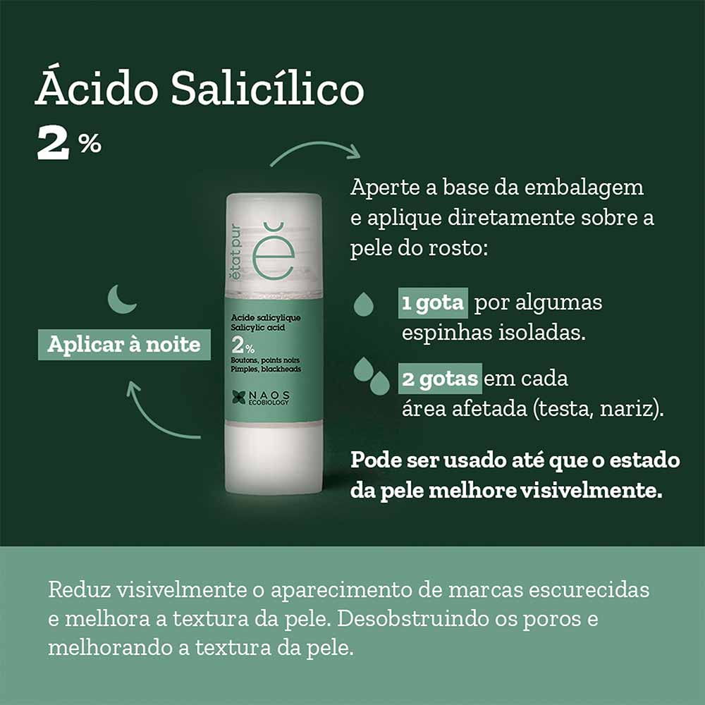 O Ácido salicílico 2% possui fortes propriedades purificantes e esfoliantes para atuar sobre as diferentes imperfeições da pele com tendência acneica: espinhas isoladas, cravos, textura da pele irregular. Um ativo incontornável a ter sempre por perto.