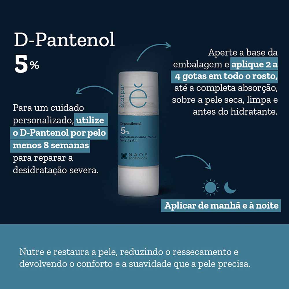 O D-Pantenol , ou Provitamina B5, é uma vitamina naturalmente presente na pele. Concentrado na dose certa, nutre e restaura a pele para reduzir significativamente o ressecamento da pele.