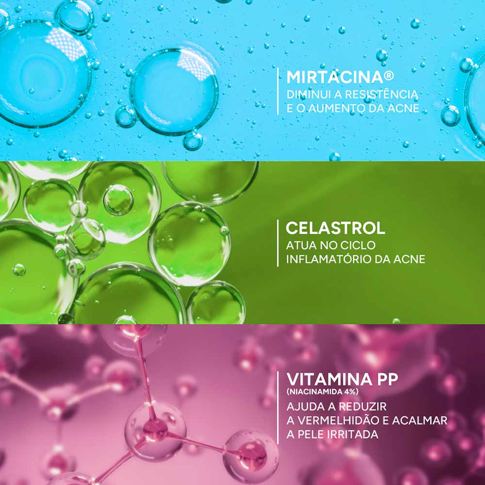 Sua fórmula potente é enriquecida com ativos patenteados de alta performance. A Myrtacina™ e o Celastrol™ trabalham em conjunto para favorecer a eliminação da acne. Enquanto a Vitamina PP (Niacinamida 4%) ajuda a reduzir a vermelhidão e a acalmar a pele irritada.