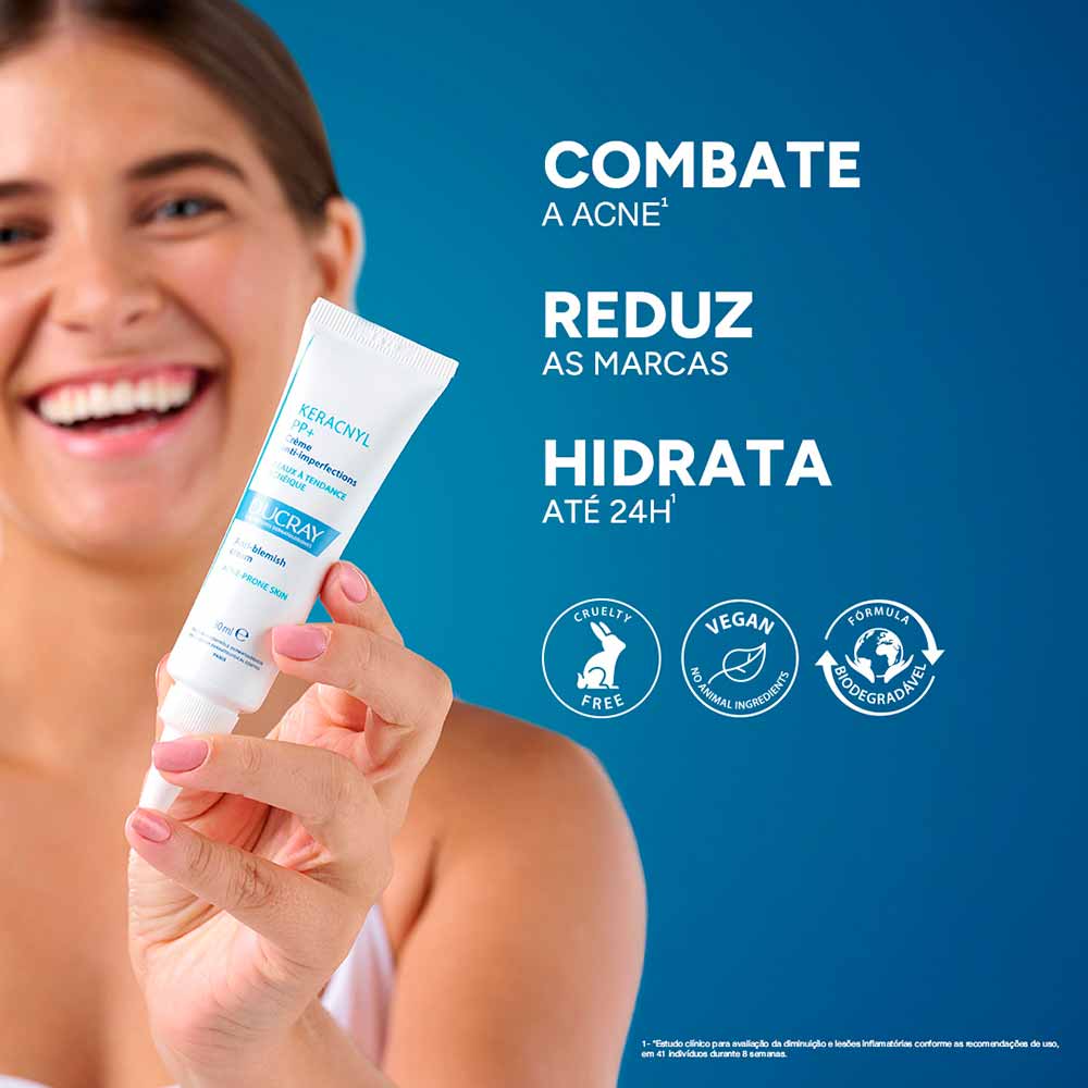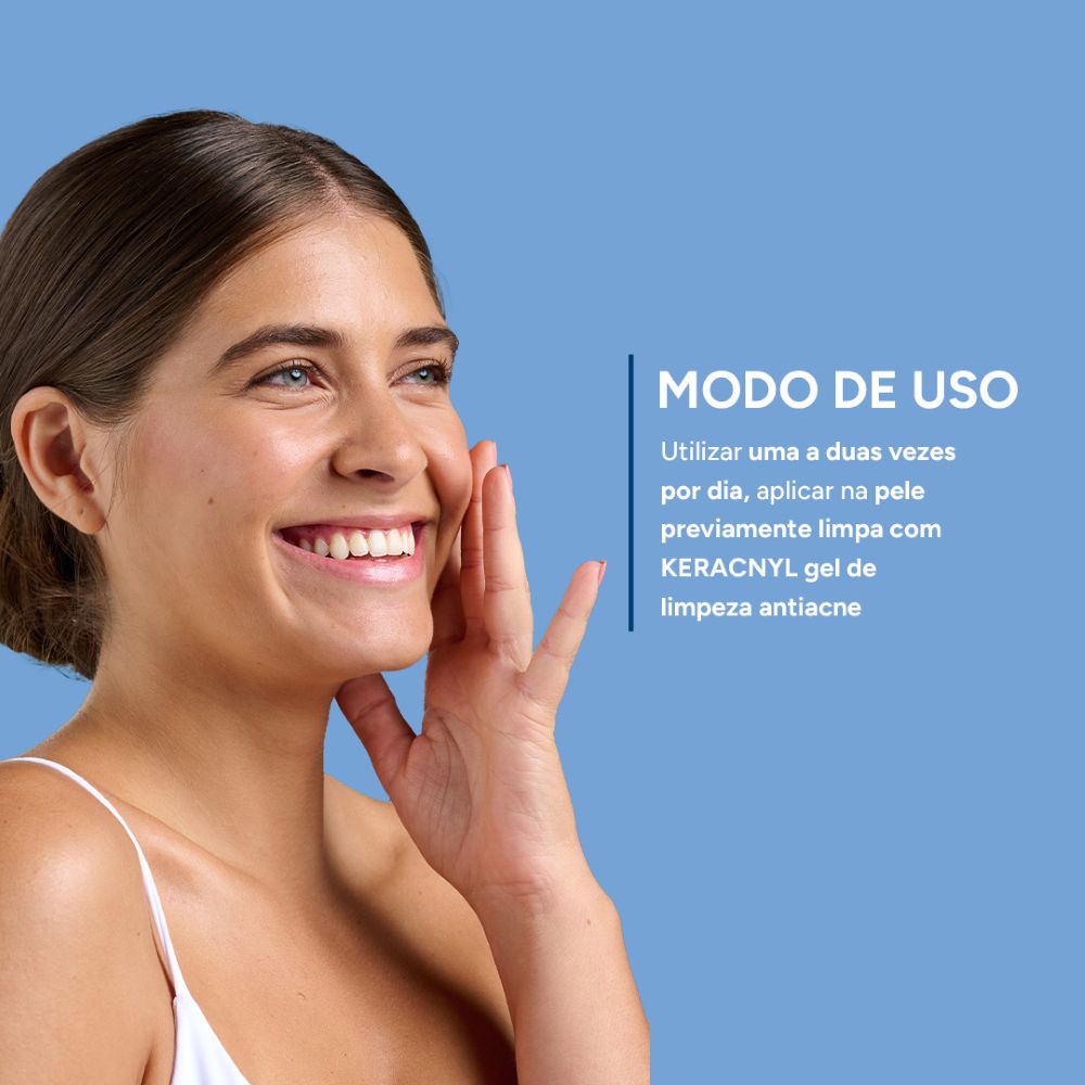 Para otimizar o tratamento, limpe a pele previamente com um sabonete específico para peles acneicas, como o Ducray Keracnyl Gel de Limpeza. A limpeza adequada prepara a pele para a absorção dos ativos, aumentando os seus resultados.