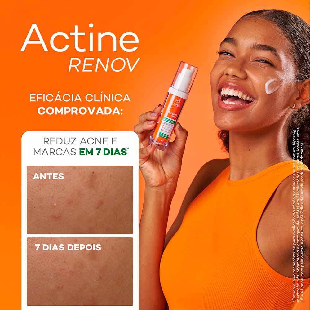 Com eficácia dermatologicamente comprovada, Actine Renov reduz acne e marcas em apenas 7 dias, prevenindo o reaparecimento das lesões e proporcionando uma pele visivelmente mais uniforme e saudável.