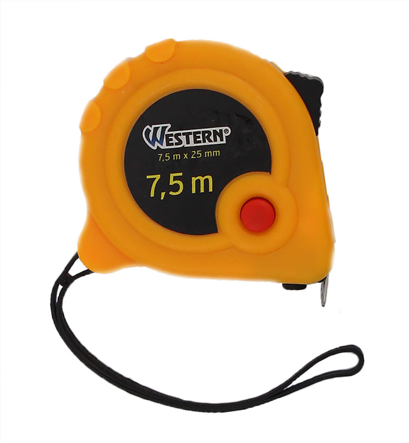 TRENA 7,5MX25MM - Dimensões da Peça: 8 x 4 x 7,5cm - Dimensões da Embalagem: 8,5 x 4 x 13cm - Quantidade Inner: 12 Peças - Dimensões Inner: 27 x 18 x 9,9cm - Quantidade Master: 48 Peças - Dimensões Master: 40 x 29 x 20cm - Material: ABS, Aço carbono - Cor: Amarela - Tipo de Embalagem: Suporte - Marca: Western - Origem: China - Contém: 1 unidade - Comprimento x Largura: 7,5m x 25mm. - Com 2 travas. - Com Imã. - Fita larga. - Cuidados: - Manter fora do alcance das crianças. - Utilize equipamentos de proteção individual. - Caracteristicas: - Medições de áreas ou superfícies em que existe a presença de partículas, pois a fita é confeccionada em fibra de vidro, possível ser lavada.
