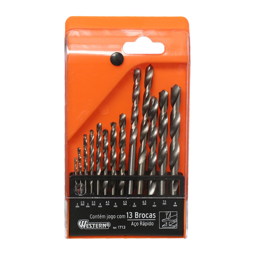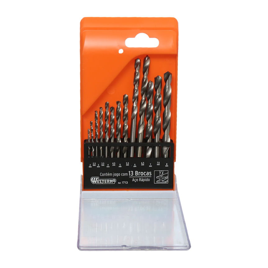 JOGO 13 BROCAS AÇO RÁPIDO 2MM A 8MM - Dimensões da Peça: - 1 Broca: 4,8cm x Ø2mm - 1 Broca: 5,6cm x Ø2,5mm - 1 Broca: 6cm x Ø3mm - 1 Broca: 6,7cm x Ø3,5mm - 1 Broca: 7,2cm x Ø4mm - 1 Broca: 7,9cm x Ø4,5mm - 1 Broca: 8,3cm x Ø5mm - 1 Broca: 9cm x Ø5,5mm - 1 Broca: 9,1cm x Ø6mm - 1 Broca: 9,7cm x Ø6,5cm - 1 Broca: 10,6cm x Ø7mm - 1 Broca: 10,7cm x Ø7,5mm - 1 Broca: 11,2cm x Ø8mm - Dimensões da Embalagem: 17 x 9,5 x 1,8cm - Quantidade Inner: 12 Peças - Dimensões Inner: 24 x 19 x 10cm - Quantidade Master: 72 Peças - Dimensões Master: 38 x 26,5 x 33cm - Material: Aço carbono - Cor: Estojo laranja - Tipo de Embalagem: Suporte - Marca: Western - Origem: China - Jogo Contendo: 13 brocas. - Tamanhos: 2 mm • 2.5 mm • 3 mm • 3.5 mm • 4 mm • 4.5 mm • 5 mm • 5.5 mm • 6 mm • 6.5 mm • 7 mm • 7.5 • 8 mm. - Cuidados: • Para reduzir o riscos de lesões, use adequadamente equipamento de proteção individual (óculos de proteção, protetor auricular, botas, máscara, luvas, etc...) Necessário ao trabalho. • Retire a ferramenta da tomada antes de instalar/trocar qualquer acessório. • Leia o manual de instruções da sua ferramenta para instalar corretamente as brocas. • Guarde em local seguro. • Guarde estas instruções para futuras consultas. • Mantenha fora do alcance das crianças.