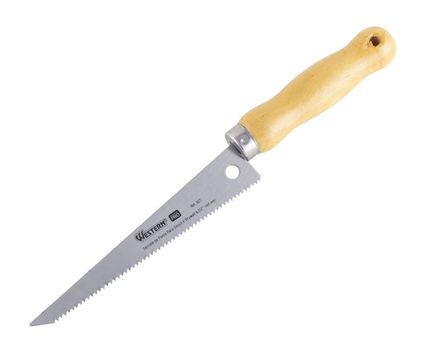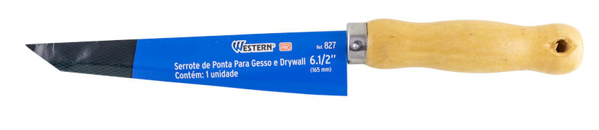 "SERROTE DE PONTA PARA GESSO 6.1/2"" - Dimensões da Peça: 30 x 3 x 2,9cm - Dimensões da Embalagem: 31,5 x 4,1 x 2,9cm - Quantidade Inner: 24 Peças - Dimensões Inner: 31,5 x 13 x 10cm - Quantidade Master: 96 Peças - Dimensões Master: 34 x 27 x 22cm - Material: Aço carbono, Madeira - Tipo de Embalagem: Bainha - Marca: Western - Origem: China. - Comprimento da lâmina: 17cm - Espessura da lâmina: 0,13cm • Cabo em Madeira de alta qualidade. • Lâmina temperada proporcionando vida longa para o produto. • Dentes projetados para cortes rápidos e práticos. - Cuidados: • Para reduzir o risco de lesões, sempre use adequadamente equipamentos de proteção individual (óculos de proteção, botas, máscara, luvas, etc...). Necessário ao trabalho. • Utiliza lâmina de serra. Tenha cuidado ao manusear e ao trocar a lâmina. • Encaixe a lâmina e parafuse bem. • Use a ferramenta correta para cada tipo de trabalho. Não force a ferramenta. A ferramenta correta fara o trabalho melhor e mais seguro se utilizada para aquilo que foi projetada. • Guarde em local seguro. • Guarde estas instruções para futuras consultas. • Manter fora do alcance das crianças."