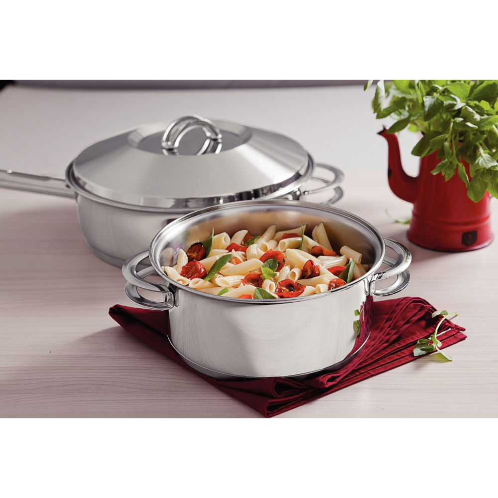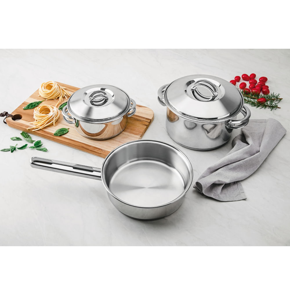 O Jogo de Panelas Tramontina em Aço Inox Fundo Triplo 6 Peças da linha Solar é um clássico da Tramontina, e um clássico é sinônimo de qualidade e durabilidade. Totalmente fabricadas em inox, não soltam resíduos nos alimentos e seu fundo triplo (aço inox + alumínio + aço inox) distribui o calor uniformemente, proporcionando um cozimento mais rápido, economizando energia e deixando os alimentos aquecidos por mais tempo. Fáceis de limpar e altamente duráveis, as panelas podem ser lavadas diariamente e ser utilizadas em todos os fogões. Esse jogo de panelas vai deixar a sua cozinha mais elegante e ajudar você no preparo das suas receitas favoritas.