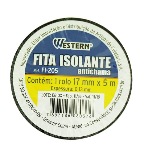 Fita Isolante 10 Rolos Western. Um produto de alta qualidade! Indicado para isolação de fios e cabos elétricos em geral. Dimensões da Peça: 5,2 x 5,2 x 1,7cm. Dimensões da Embalagem: 17,8 x 5,2 x 5,2cm. Material: Filme de PVC, adesivo a base de PSA. Cor: Preto. Tipo de Embalagem: Shrink. Marca: Western. Contém 10 Rolos: 17mm x 5 m. Espessura: 0,13mm. Armazene a fita em um local seco, arejada e ao abrigo de luz solar direta, o produto deve ser mantido nas partes medianas das prateleiras e em ambiente protegido, na embalagem original, a temperatura de estocagem não deve exceder 30°C por longos períodos, manter fora do alcance das crianças.