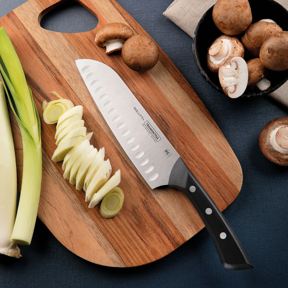 A Faca Santoku Tramontina Solutta 7"" Preta é a ferramenta essencial para precisão e versatilidade na cozinha. Com lâmina em aço inox e cabo em policarbonato, garante cortes eficientes e seguros para o dia a dia.