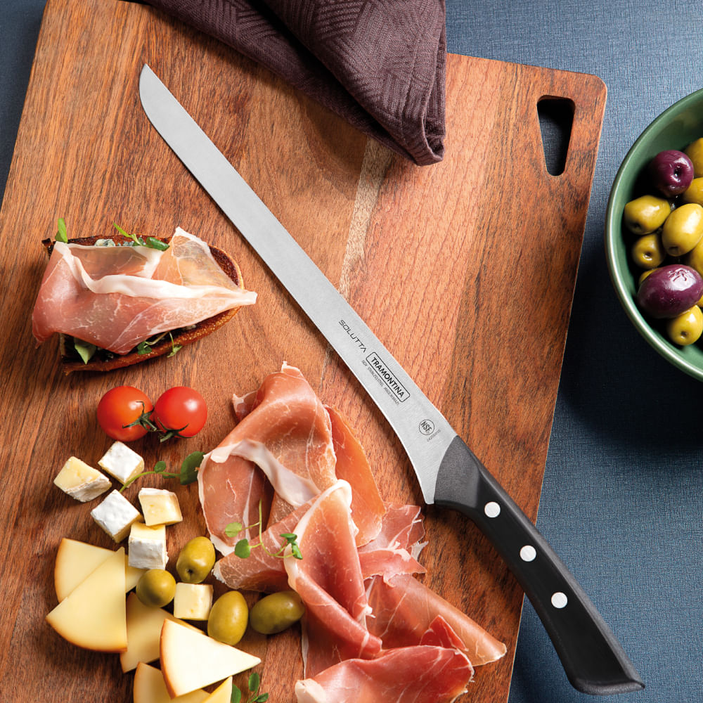 A Faca Jamoneira Tramontina Solutta é a ferramenta ideal para precisão no corte de frios e carnes curadas. Eleve sua experiência ao fatiar jamón e outras iguarias com uniformidade.
