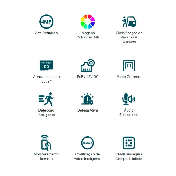 Visão Colorida: Proporciona imagens coloridas e vibrantes, mesmo em condições de baixa luminosidade, para uma vigilância aprimorada 24 horas por dia.