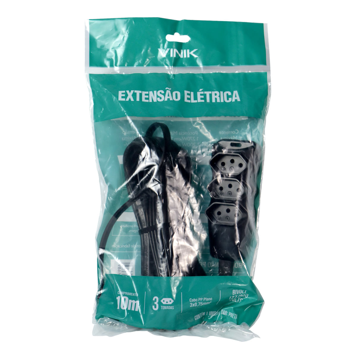 Extensão Elétrica 3 Tomadas PP Plano 10m Preta Vinik