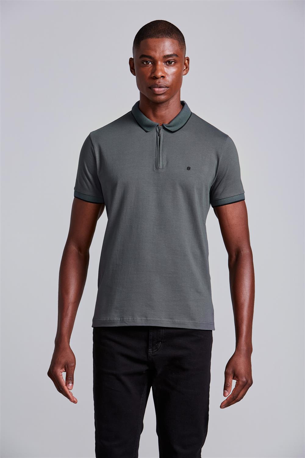 Polo Manga Curta com Zíper Slim Fit - Cinza Grafite