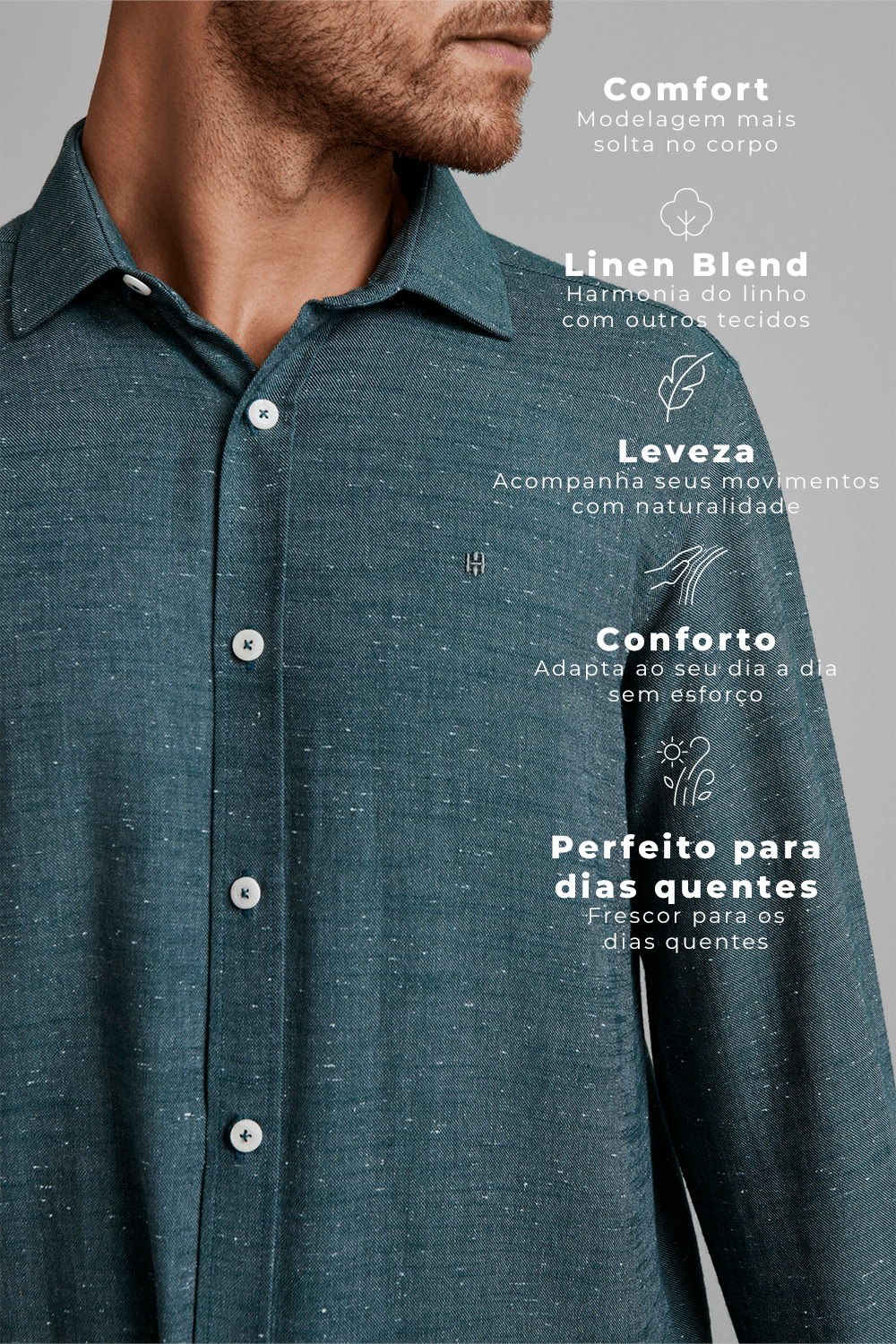 A Camisa Linen Blend Comfort é confeccionada em 51% Algodão, 35% Viscose, 16% Modal e 3% Linho, oferece leveza, frescor e conforto, ideal para climas quentes. A peça conta com colarinho Londres.