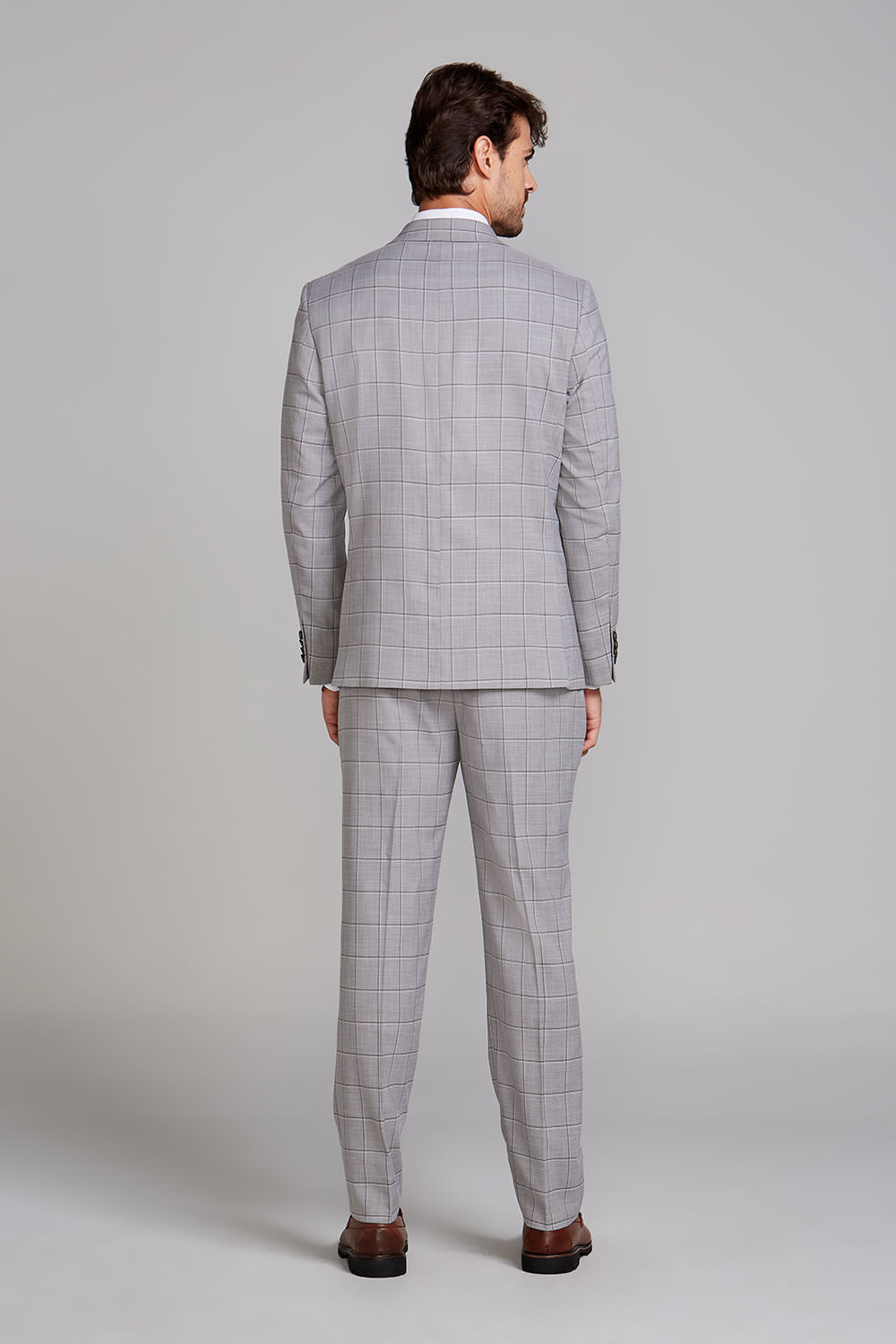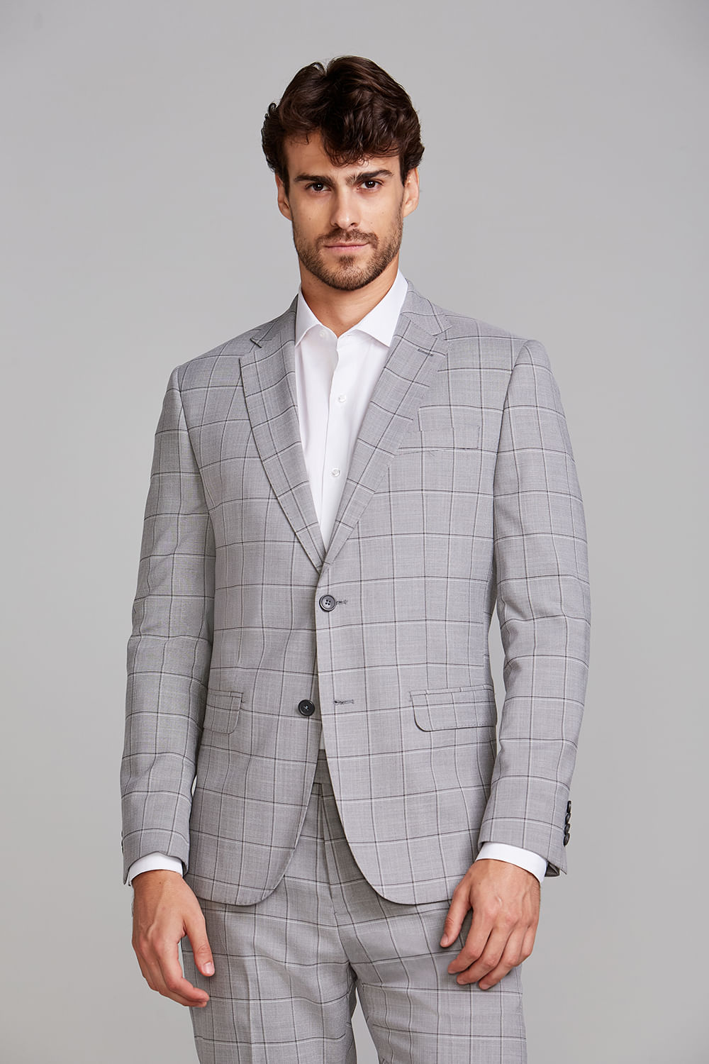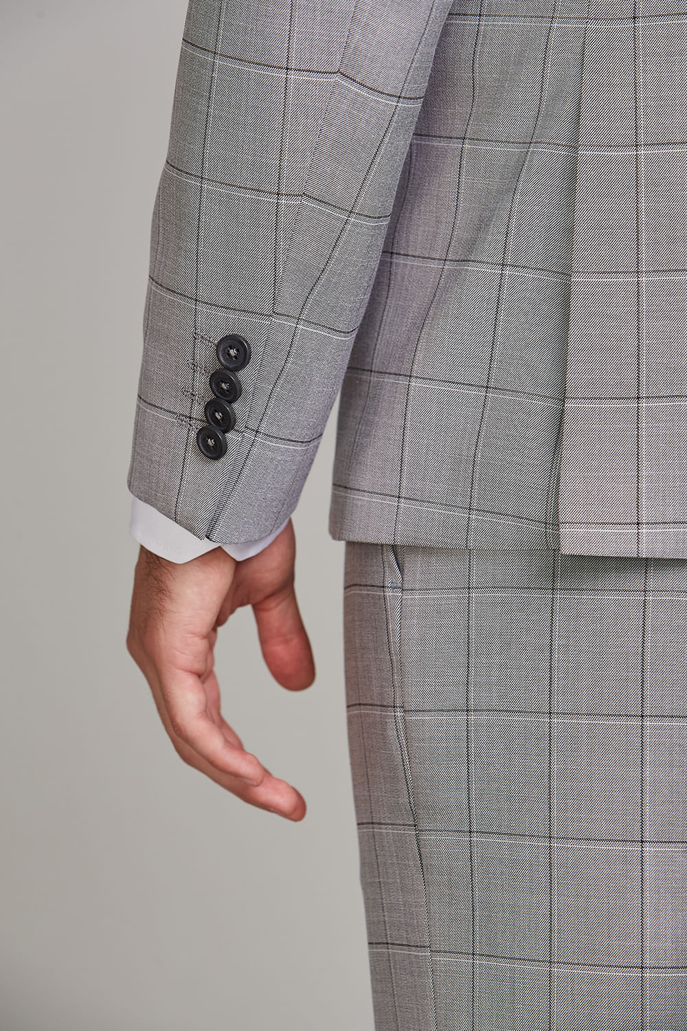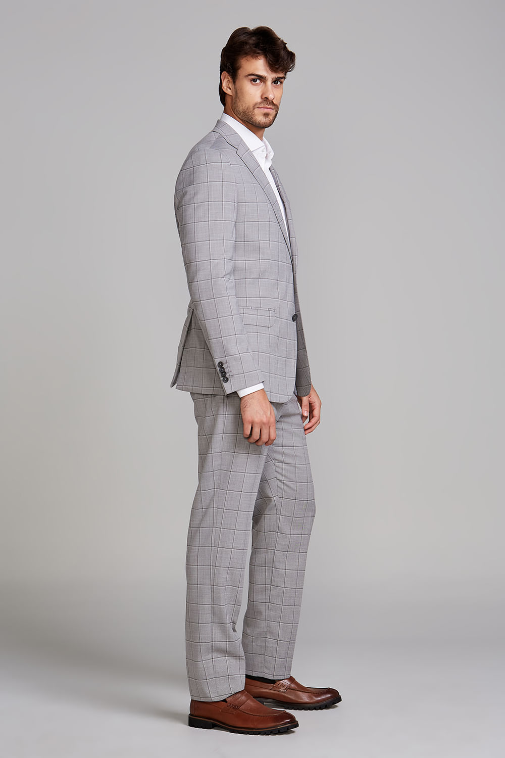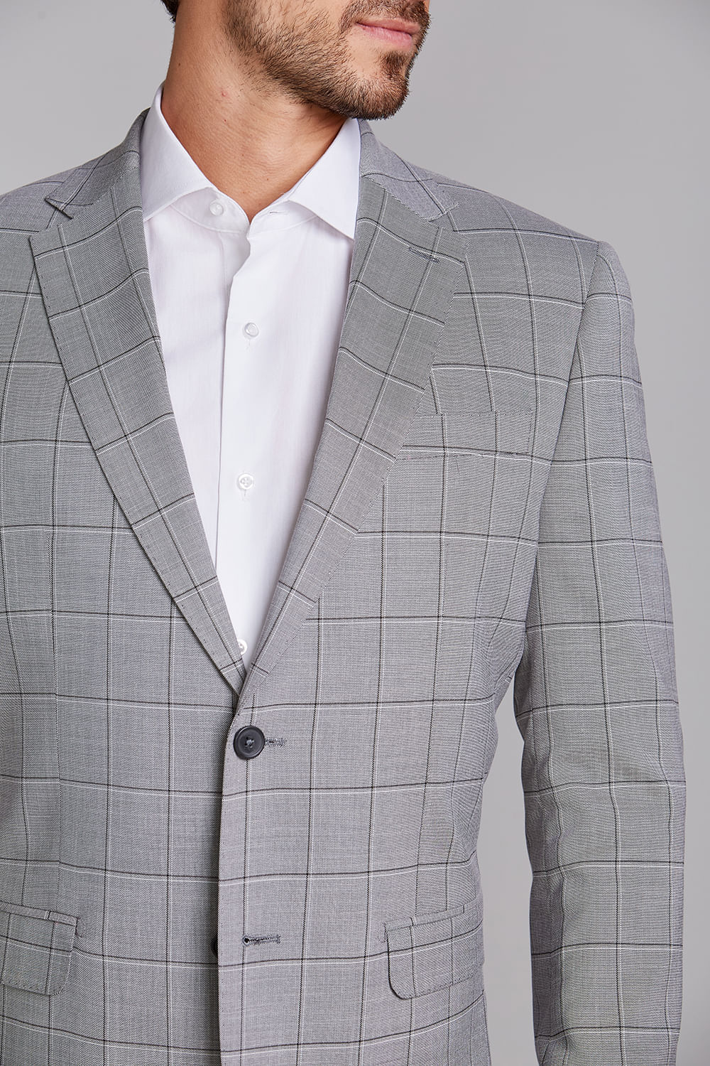 O Terno Xadrez é de Poliviscose e composto por 84% Poliéster, 14% Viscose e 2% Elastano. A Poliviscose é uma fibra sintética que têm a vantagem de ser mais resistentes e durável, além de estabilizar melhor a cor e o brilho. A peça conta com 2 cortes traseiros e 2 botões frontais. Este produto acompanha o paletó e a calça social.