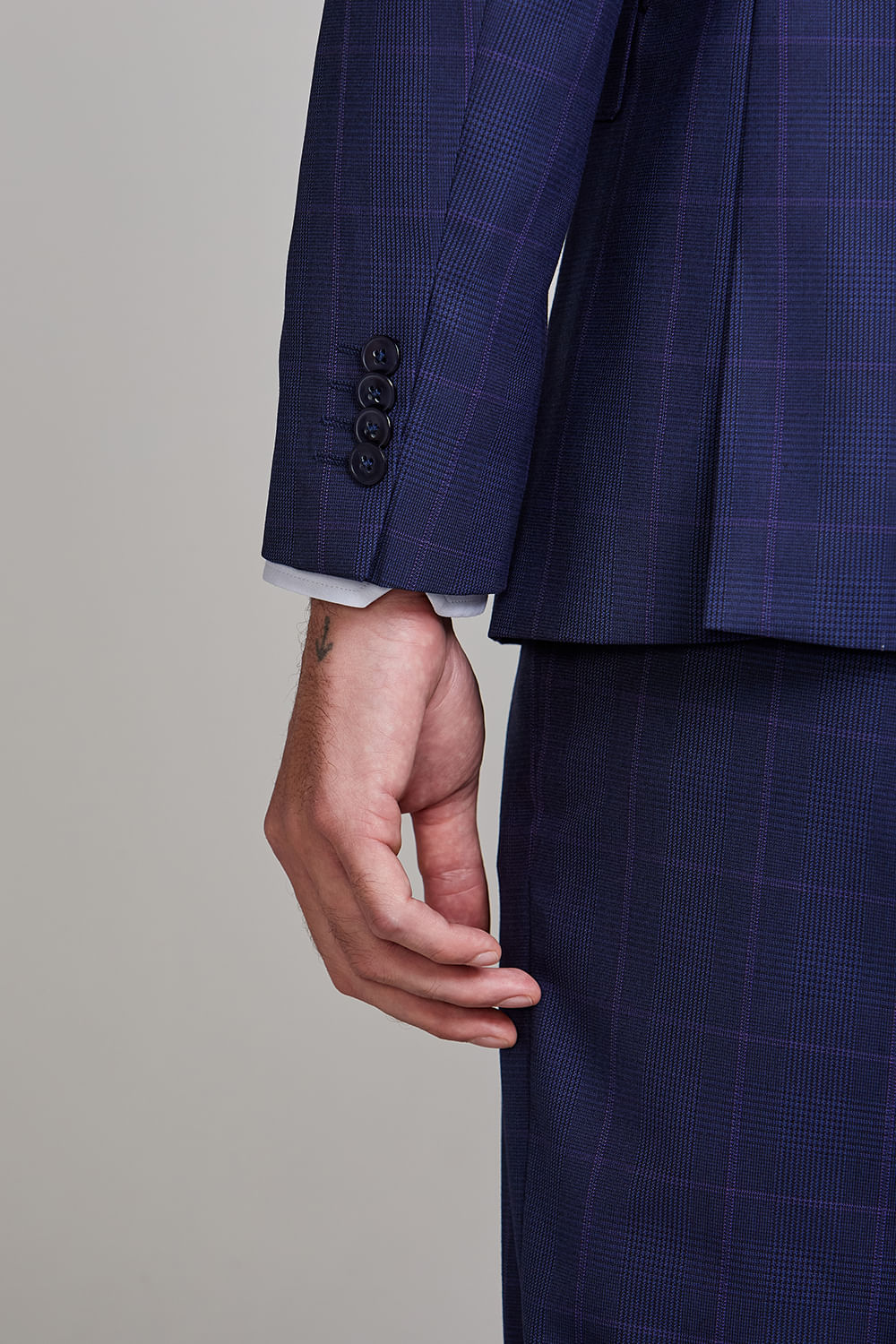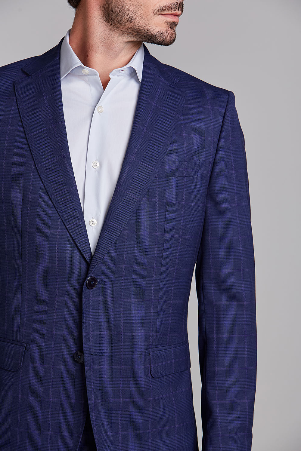 O Terno Principe de Gales é de Poliviscose e composto por 65% Poliéster e 35% Viscose. A Poliviscose é uma fibra sintética que têm a vantagem de ser mais resistentes e durável, além de estabilizar melhor a cor e o brilho. A peça conta com 2 cortes traseiros e 2 botões frontais. Este produto acompanha o paletó e a calça social.