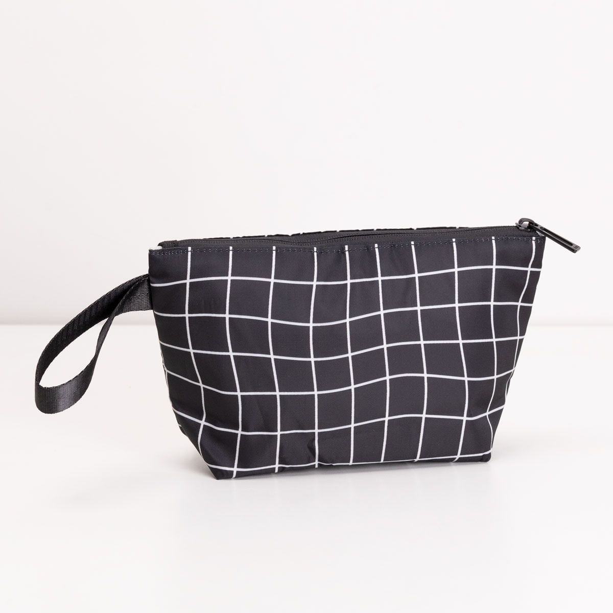 Toda preta com um delicado grid branco sobreposto, ela conta com um forro térmico, que ajuda a conservar os seus cosméticos e os seus alimentos, e uma alça de mão, sendo uma ótima opção para presentear aquela pessoa querida ou se presentear!