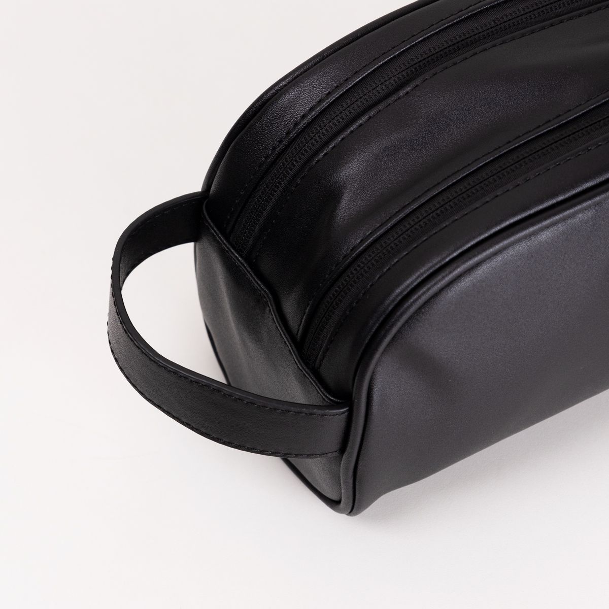 puxadores de zíper ligados por faixa conectora (que também serve de alça de mão quando a nécessaire está fechada e na vertical).