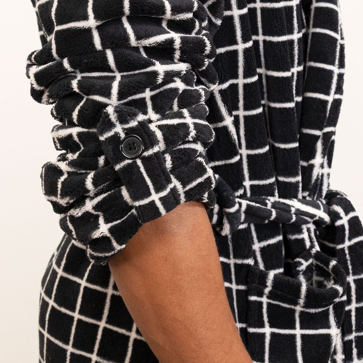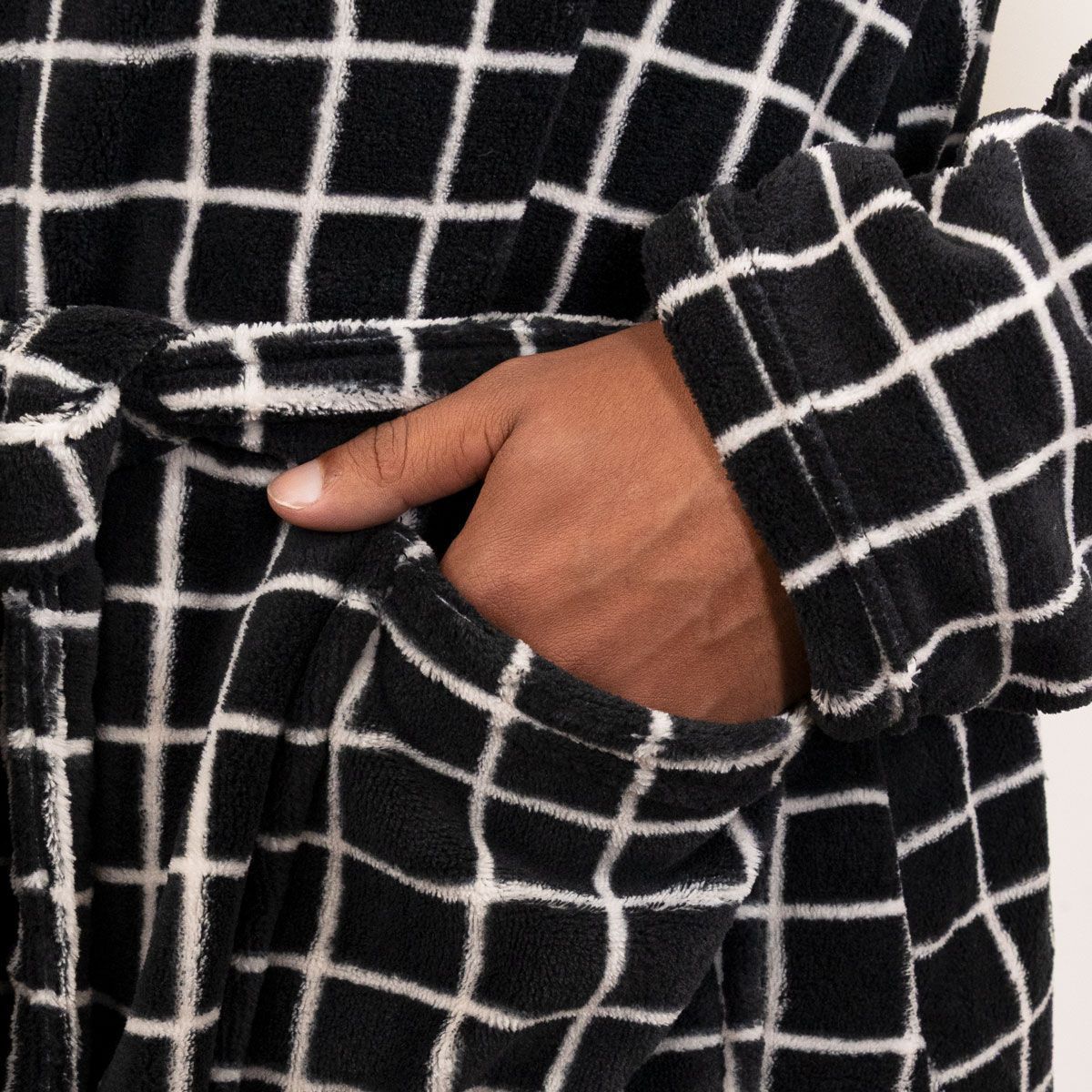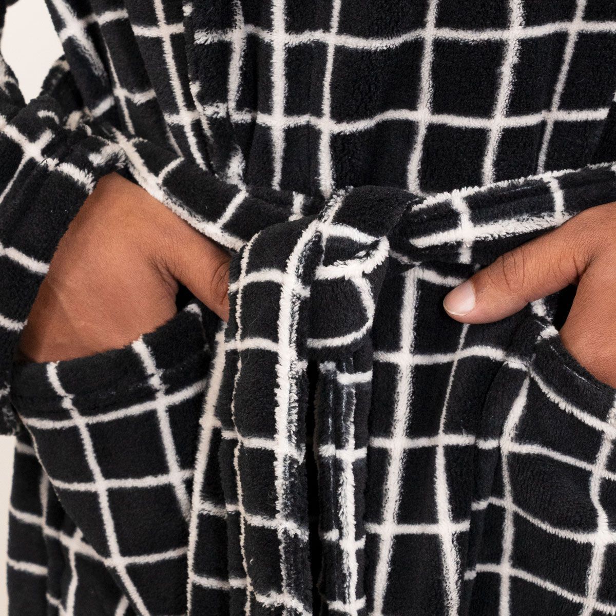 Todo em fleece na cor preta e contando com uma estampa grid, ele traz uma textura super macia ao toque, 2 bolsos, 1 faixa para amarrar na cintura e 2 botões nas mangas, pensados para que você possa dobrá-las e prendê-las no dia a dia.