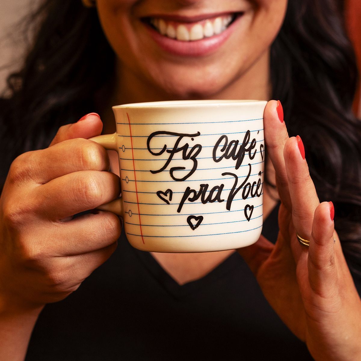 Toda em cerâmica e com capacidade para 300 ml, ela conta com 1 caneta com apagador e traz uma estampa que remete a uma folha de caderno pautada, sendo uma excelente opção de caneca criativa para presentear aquela pessoa querida ou até mesmo para se presentear!