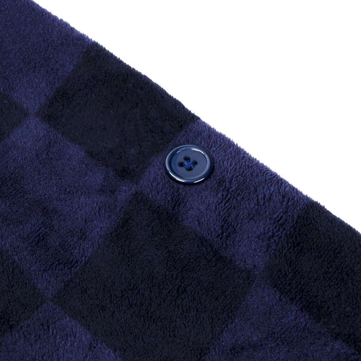 Todo em fleece com uma estampa xadrez nas cores azul-marinho e preto, ele conta com uma textura super macia ao toque, além de 2 bolsos, 1 faixa para amarrar na cintura e 2 botões nas mangas, pensados para que você possa dobrar as mangas e prendê-las no dia a dia.