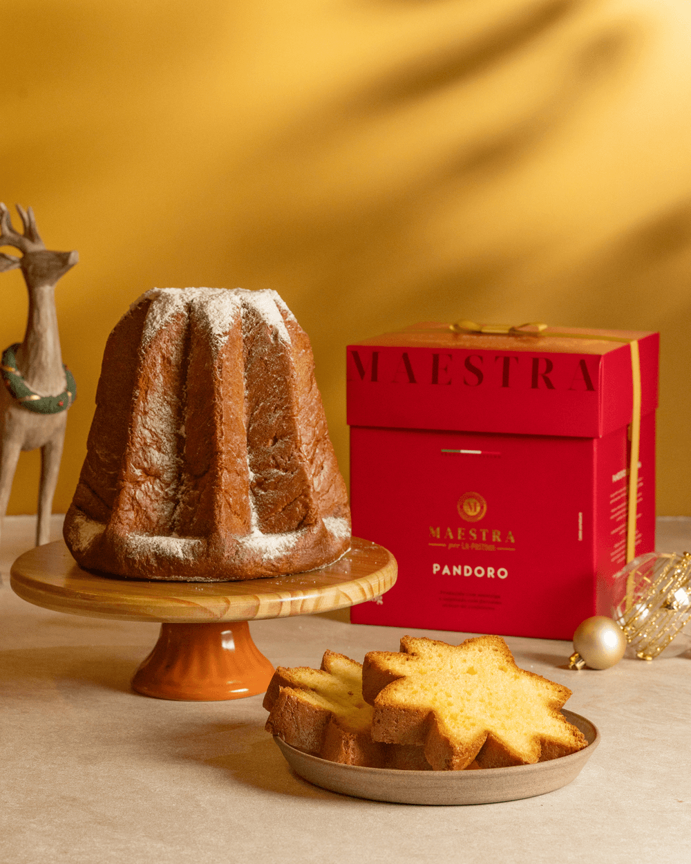 • O Pandoro, ou “Pan de Oro”, é um pão doce clássico de Verona, conhecido por sua leveza e sabor único. Produzido artesanalmente com 100% manteiga e fermentação natural, ele conquista com seu aroma exclusivo, o Aroma Spumadoro, obtido de um blend de essências cítricas. Acompanha açúcar de confeiteiro para a decoração final. Ideal para presentear ou compor a mesa de Natal, o Pandoro combina perfeitamente com espumantes como TOSTI, CHARLES NINOT ou VILARNAU, proporcionando uma experiência completa.