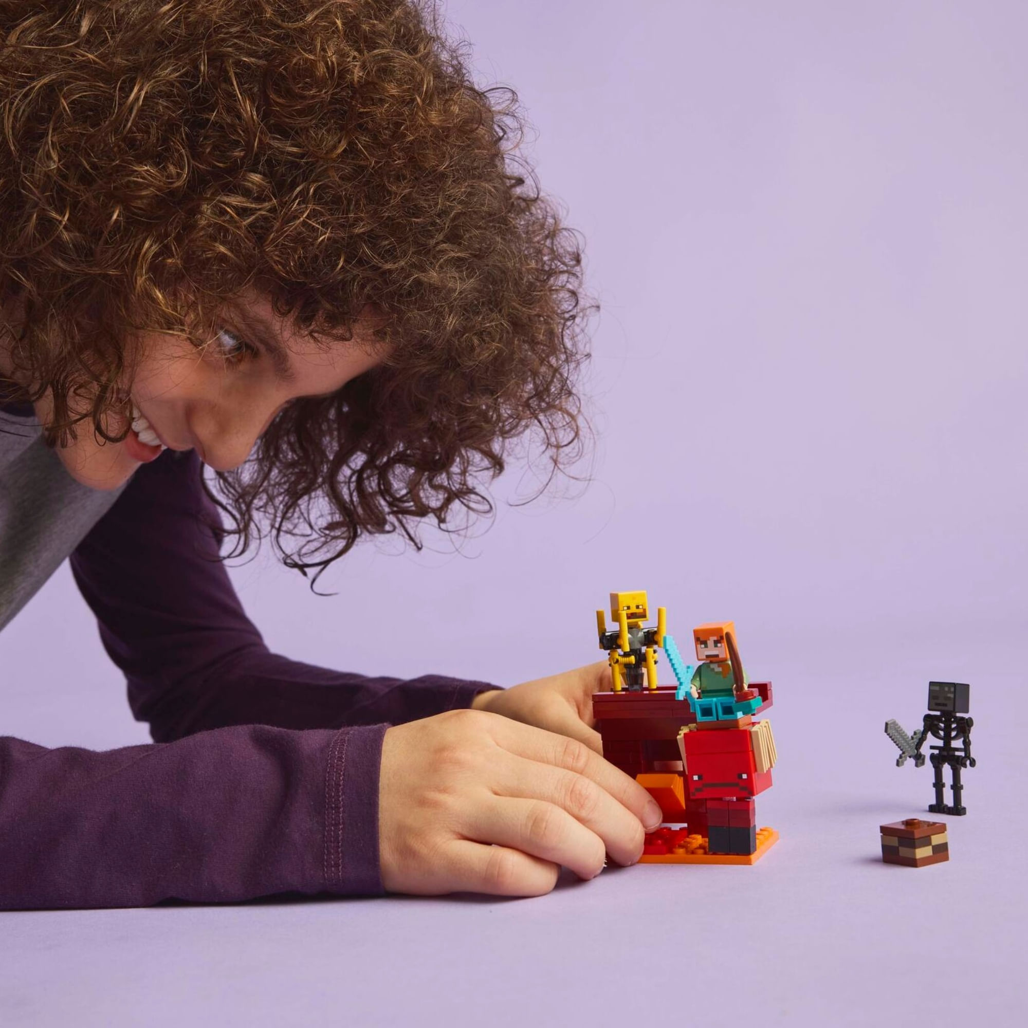 As crianças se juntam ao herói de ação do Minecraft Alex em uma missão para remover detritos antigos de uma seção da ponte da fortaleza Nether na floresta carmesim. Quando os detritos são removidos, elementos de lava caem automaticamente em cascata, e as figuras do Minecraft – um esqueleto wither empunhando uma espada de pedra e um blaze girando uma vara – bloqueiam a fuga de Alex. As crianças usam uma espada de diamante icônica para lutar contra os mobs antes de fugir em outra figura do Minecraft, um strider, que apresenta pernas articuladas e uma sela. Os jogadores do Minecraft sabem que devem agarrar alguns fungos deformados para conseguirem guiar o strider. Para diversão digital extra, o aplicativo LEGO Builder permite que as crianças ampliem e girem modelos em 3D usando seus dispositivos.