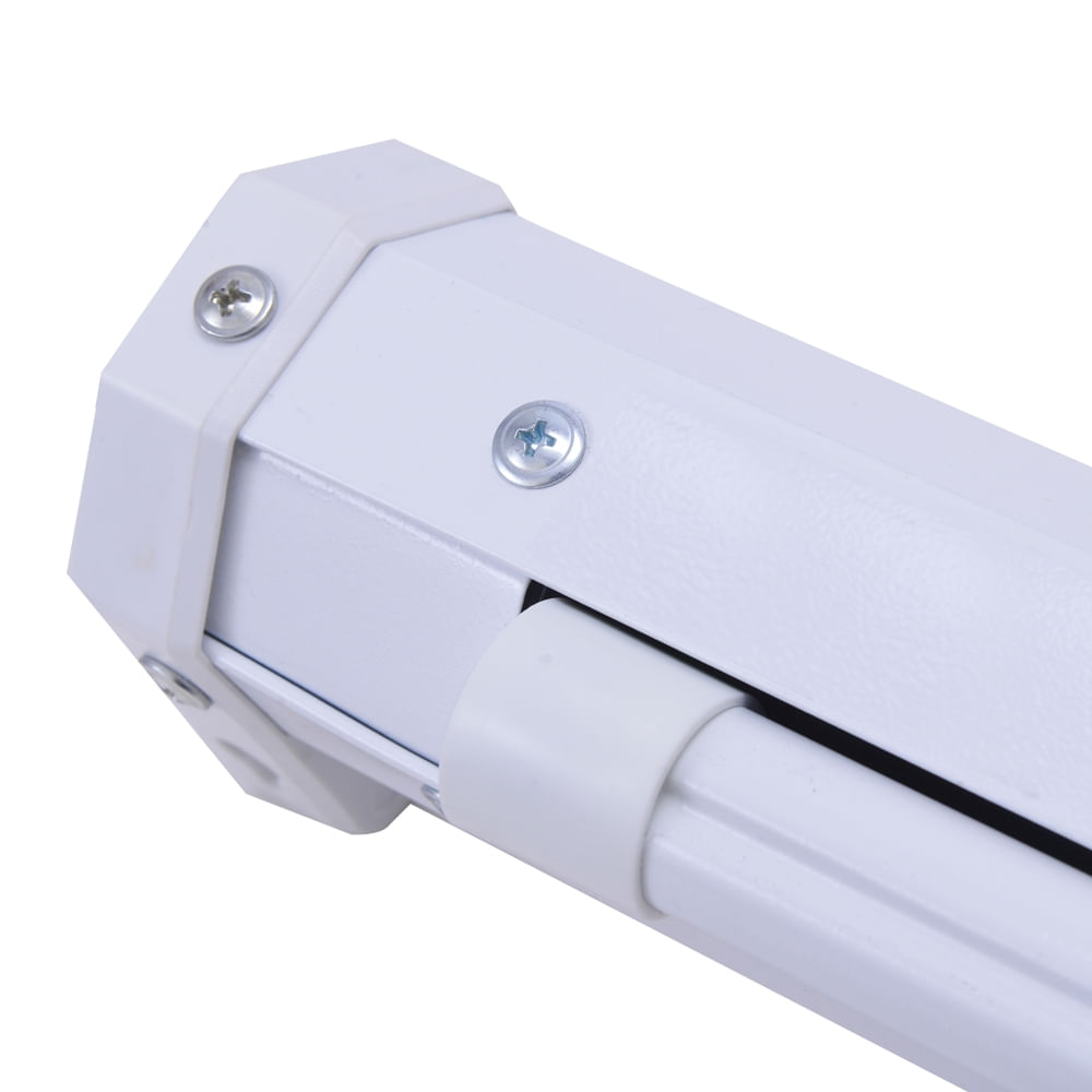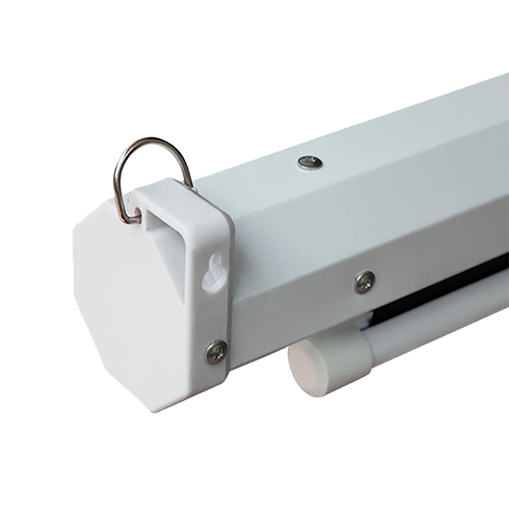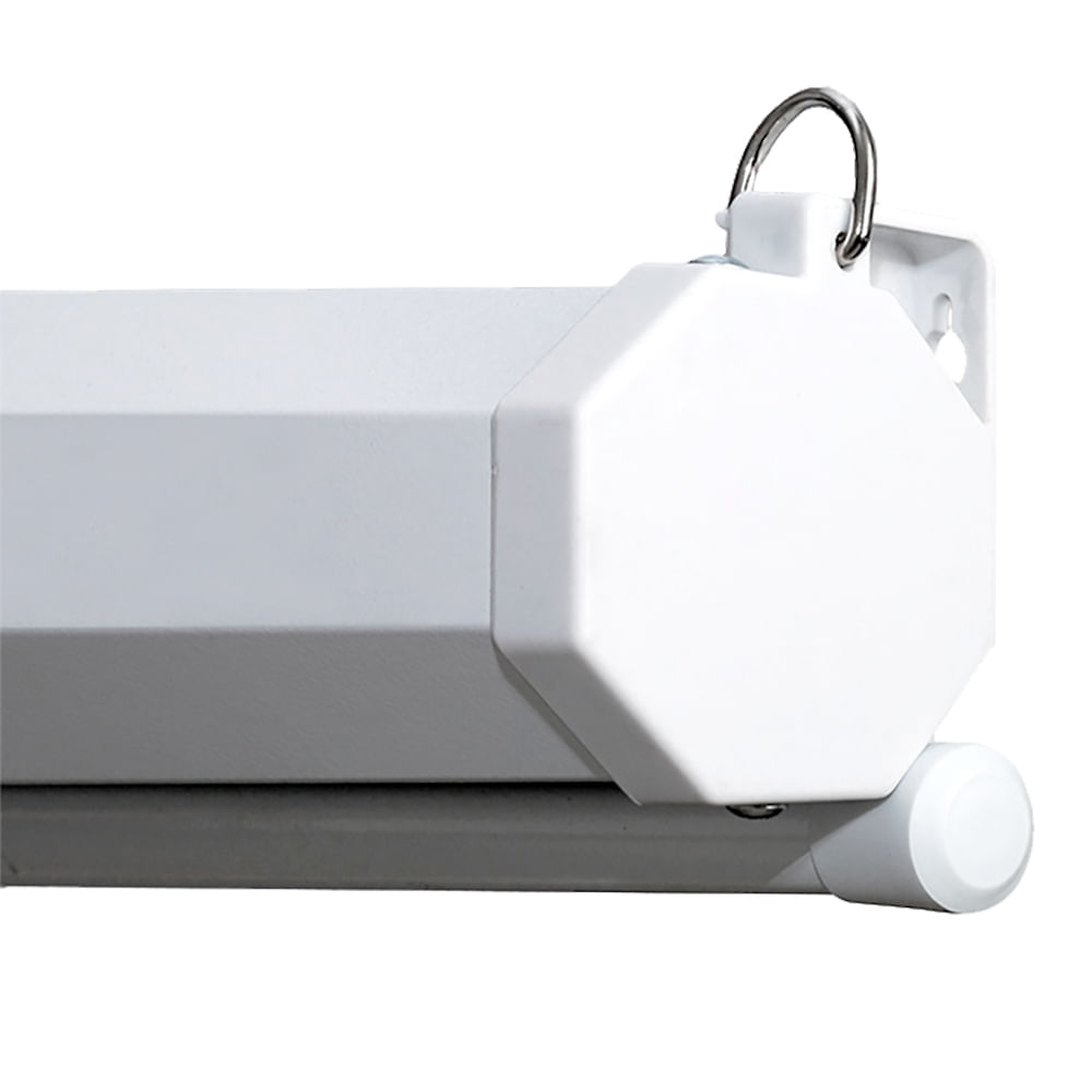 O estojo metálico, fabricado em aço carbono com resistente pintura eletrostática, protege a tela, assegurando maior durabilidade. A tela conta com acionamento manual e enrolamento automático, facilitado por um sistema de mola interna.