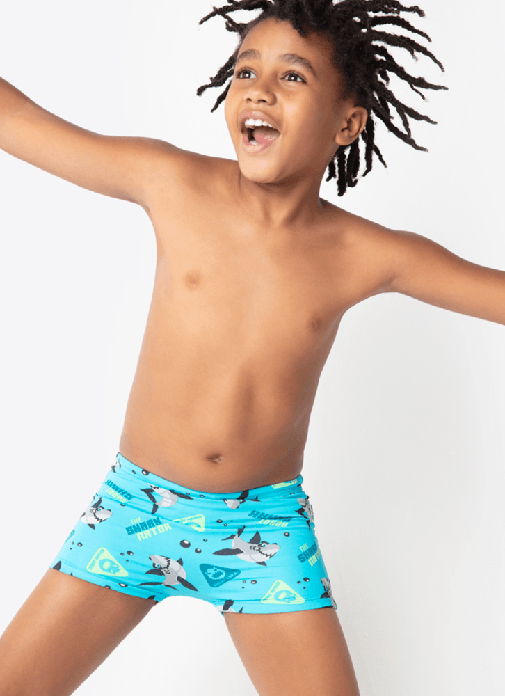 Sunga boxer com estampa corrida de tubarão, cós regulável com elástico embutido e cordão interno. - Nome do Produto: Sunga boxer corrida kids tubarão - Modelagem : Sunga regulável com elástico interno no cós. - Estampa sunga: estampa corrida em toda a peça. - Tecido externo: 92% poliamida e 8% elastano. - Tecido interno: 88,6% poliamida e 11,4% elastano - Ocasião de uso: Ideal para usar em clubes, academias, piscinas, praia. - Grade: 1 / 2 / 4 / 6 / 8 - Diferencial do produto: estampa corrida, tecido com toque macio; cós com elástico interno e regulagem de tamanho, cordão, produto altamente resistente ao cloro; proteção solar UV (não substitui o uso de filtro solar); conforto. - Como lavar e conservar bem meu produto: Lavagem à mão, temperatura máxima de 40c; não alvejar / não branquear; não secar em tambor; secagem em varal; não passar; não limpar a seco, não remover manchas com solventes; não guarde a peça úmida ; não use amaciantes ou produtos com alvejantes a base de cloro; evite contato com superfícies ásperas ; cloro e bronzeadores podem manchar o produto; após o uso, enxague bem a peça com agua fria; a contínua exposição à luz forte e água clorada pode deteriorar alguns tipos de tecidos e cores. - Garantia por defeito: Deverá ser encaminhado dentro da embalagem original; Sem indícios de uso; acompanhado de nota fiscal e com todos os itens constantes na solicitação de troca.