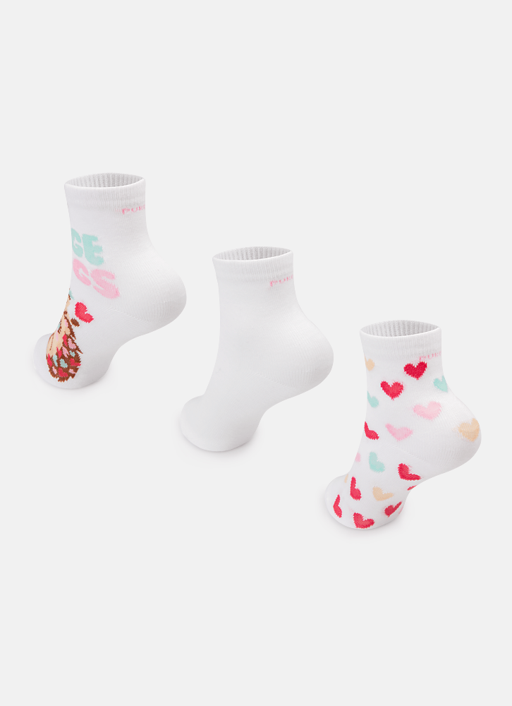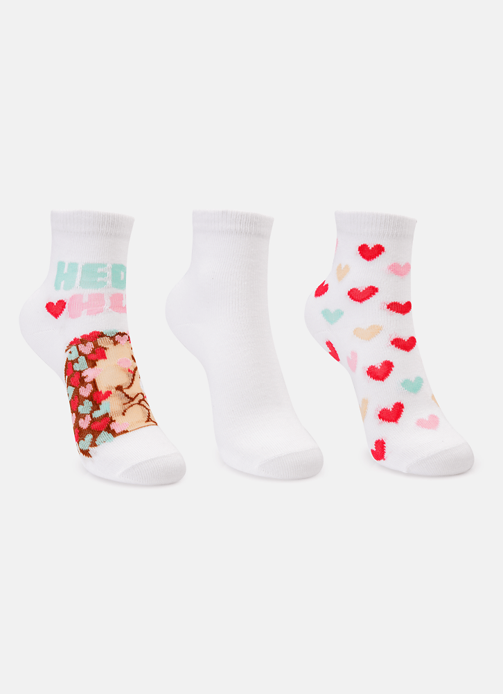 Kit com três pares de meias em algodão macio, sendo duas com desenhos divertidos e uma em cor lisa.