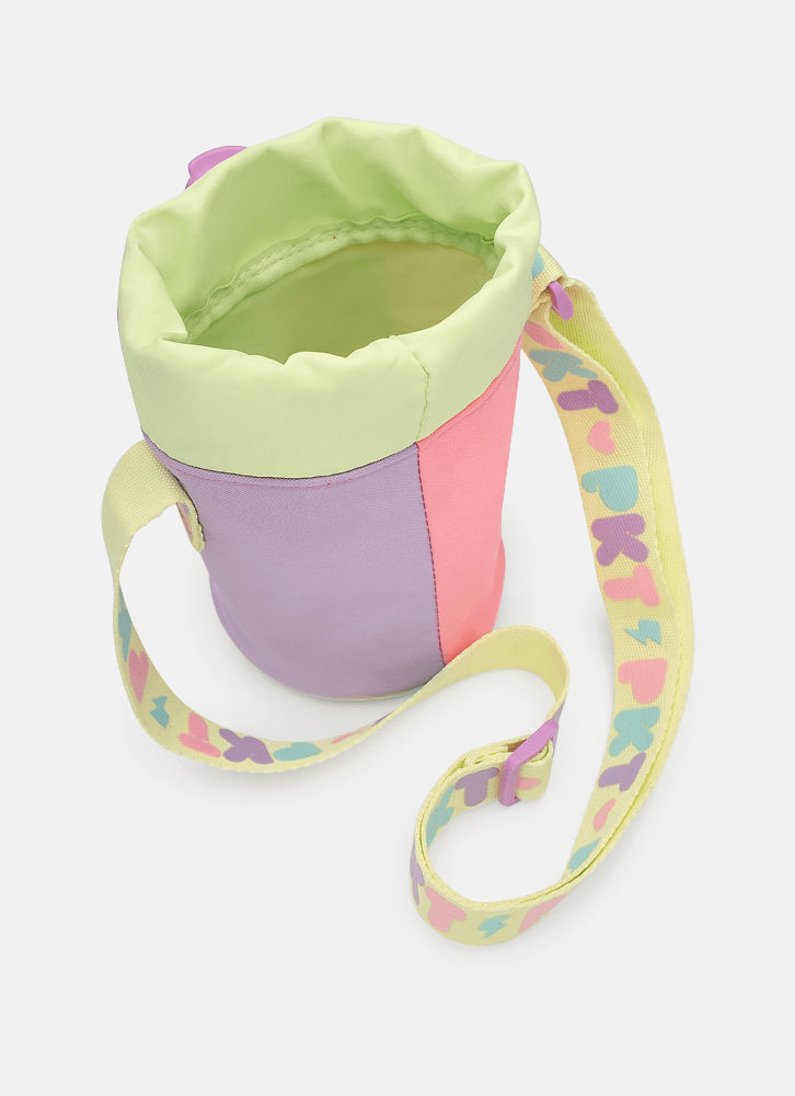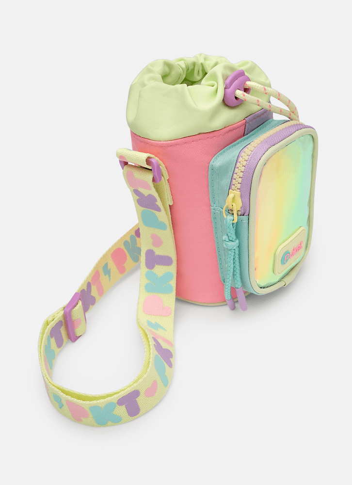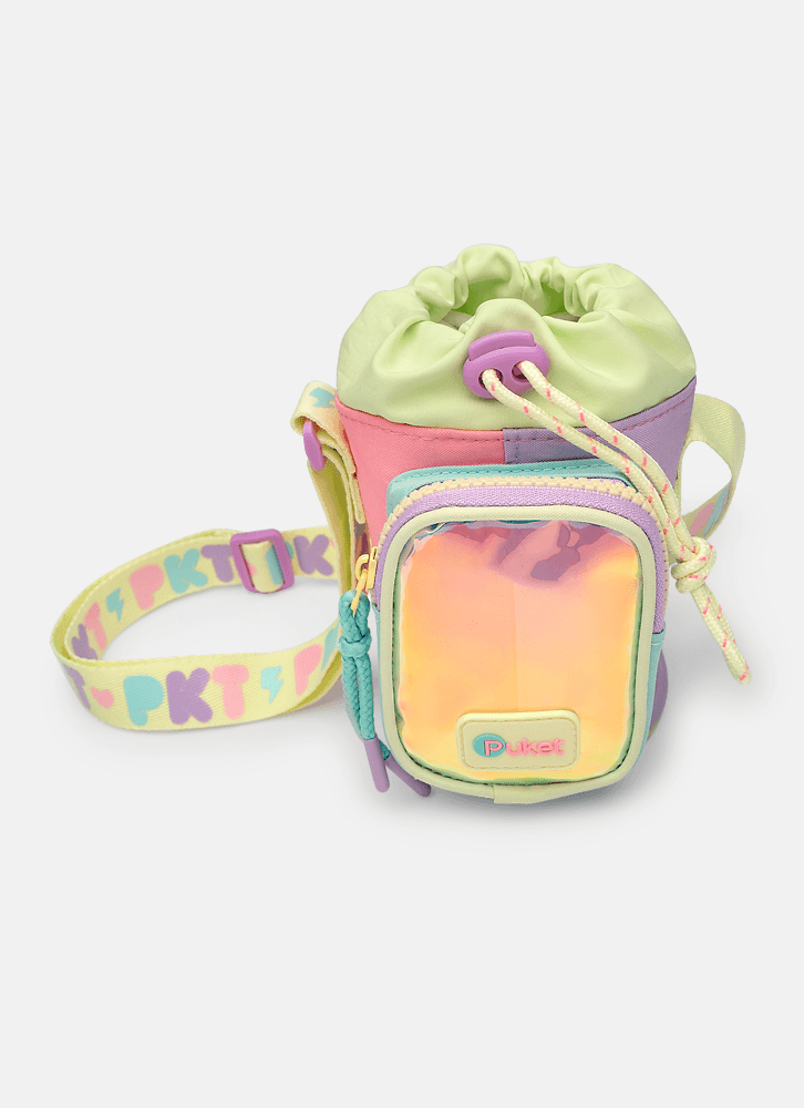 Bolsinha para garrafa em nylon color block. Parte frontal com bolso em TPU holográfico. Fechamento regulável por cordão. Alça de ombro regulável.
