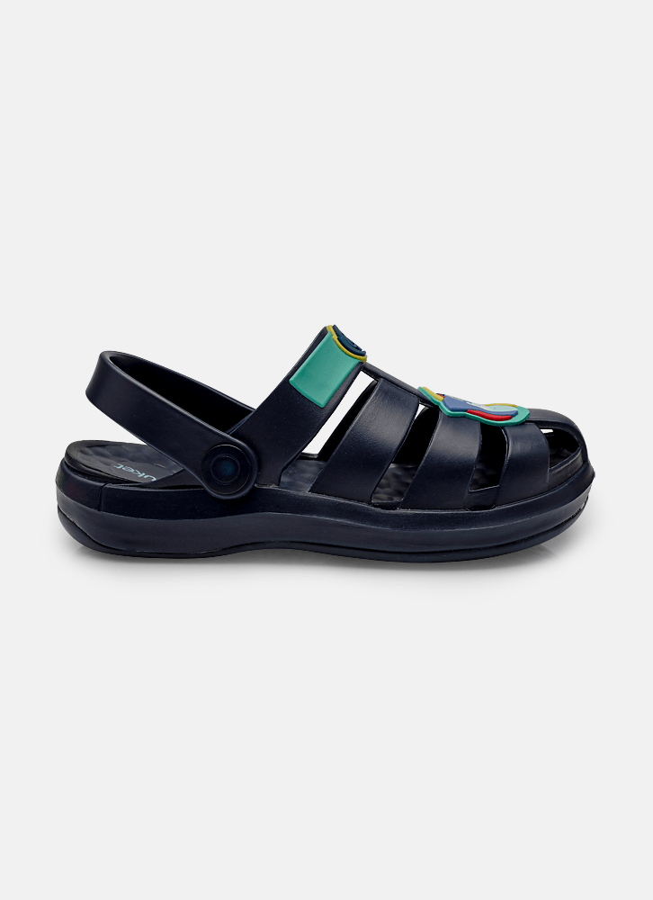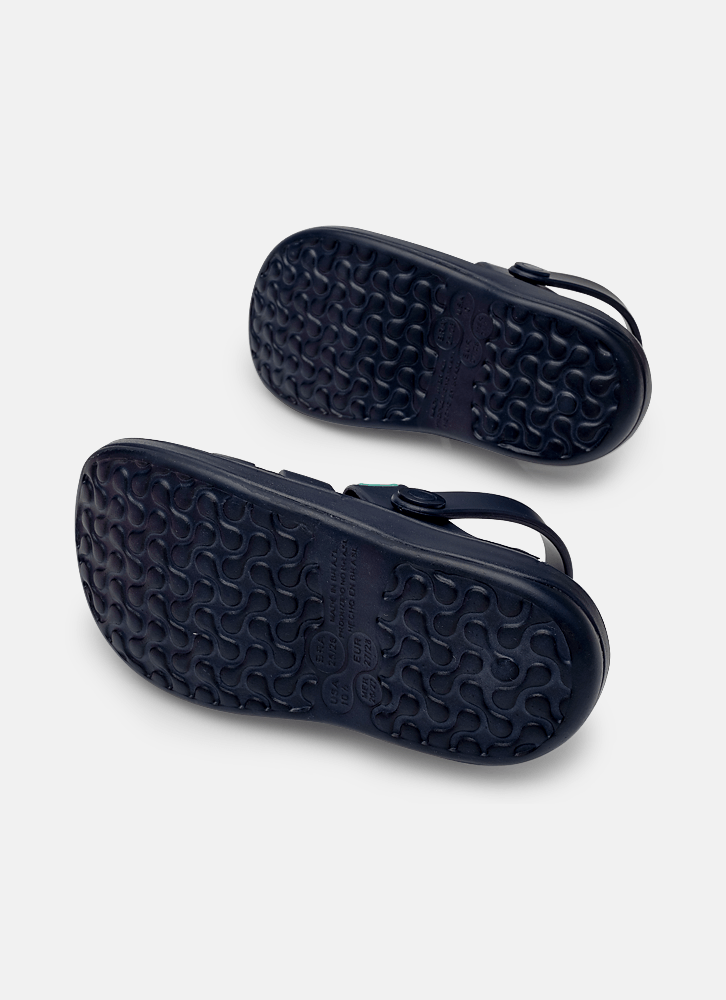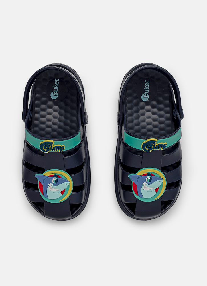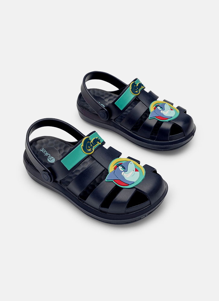 Sandália aberta de tiras em PVC de Tubarão. Possui tira posterior móvel, aplique frontal de tubarão e aplique de frase na tira superior.