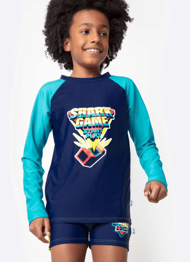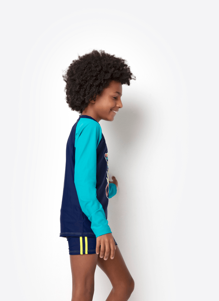 Diferencial do produto: estampa frontal, ombros expansíveis, manga longa contrastante, tecido com toque macio, produto altamente resistente ao cloro; proteção solar UV (não substitui o uso de filtro solar); conforto.