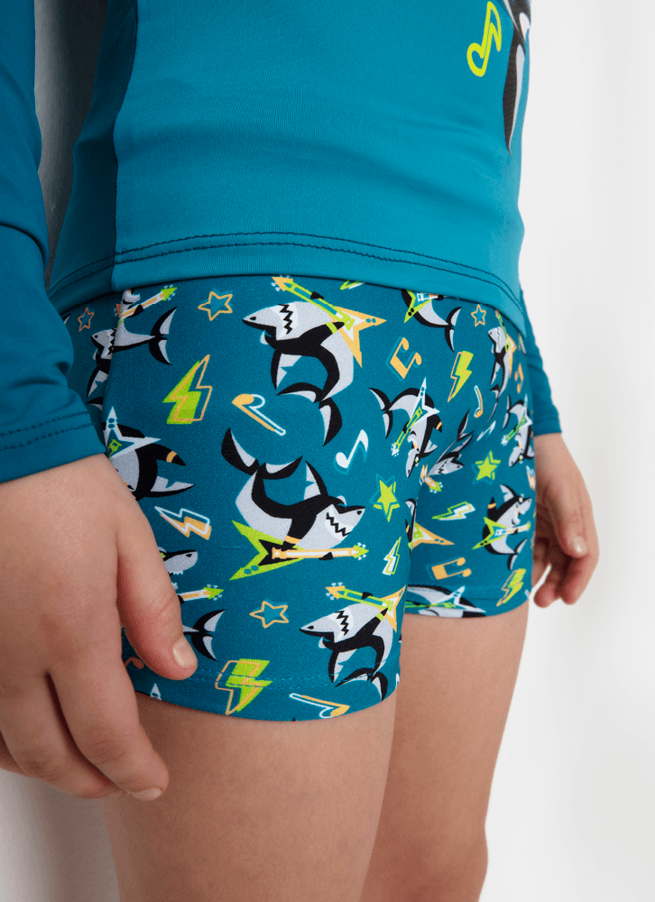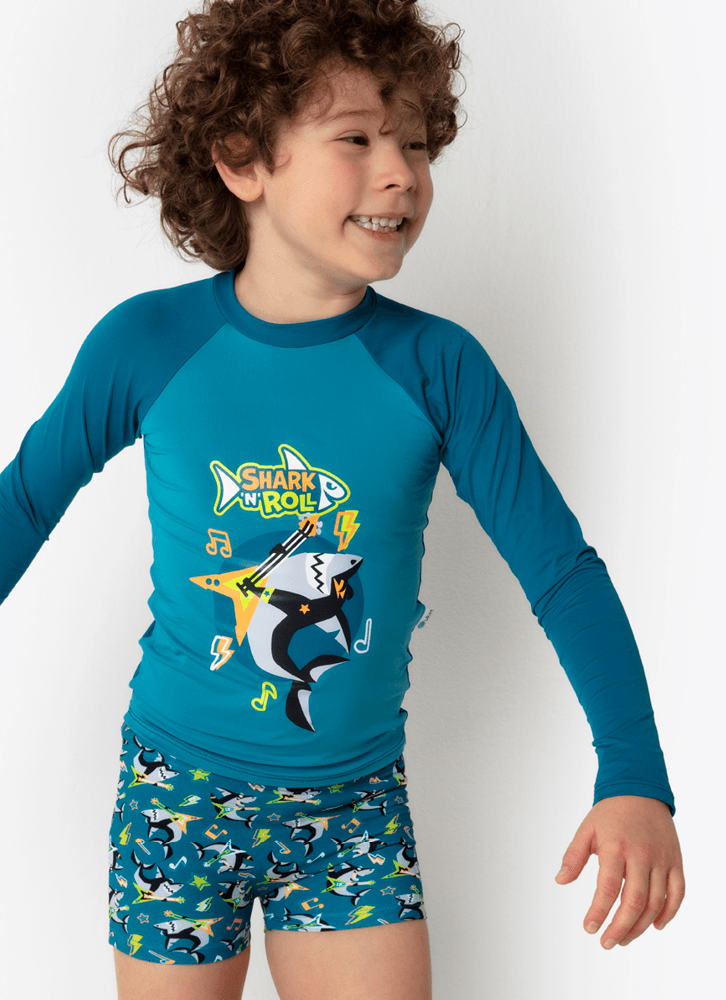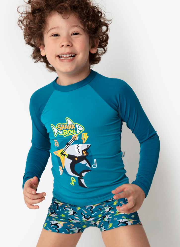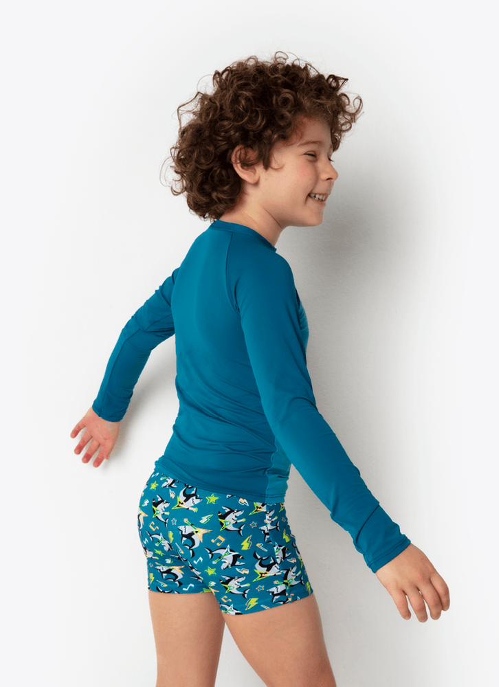 Descrição: conjunto composto por camiseta manga longa raglan e sunga boxer. Estampa localizada de tubarão na camiseta e sunga em estampa corrida.