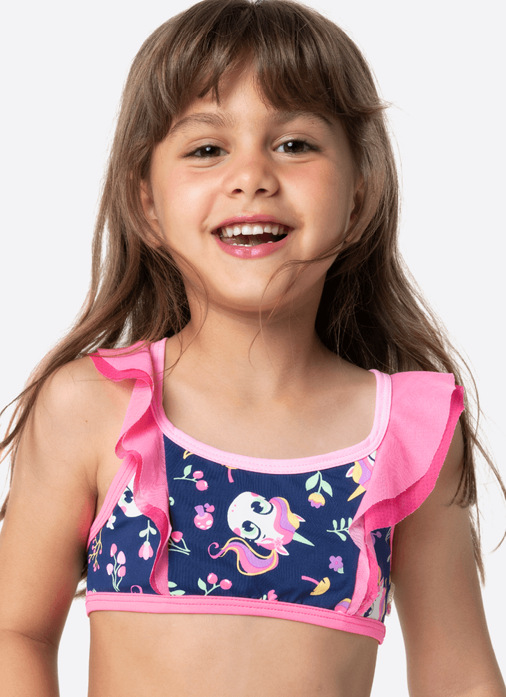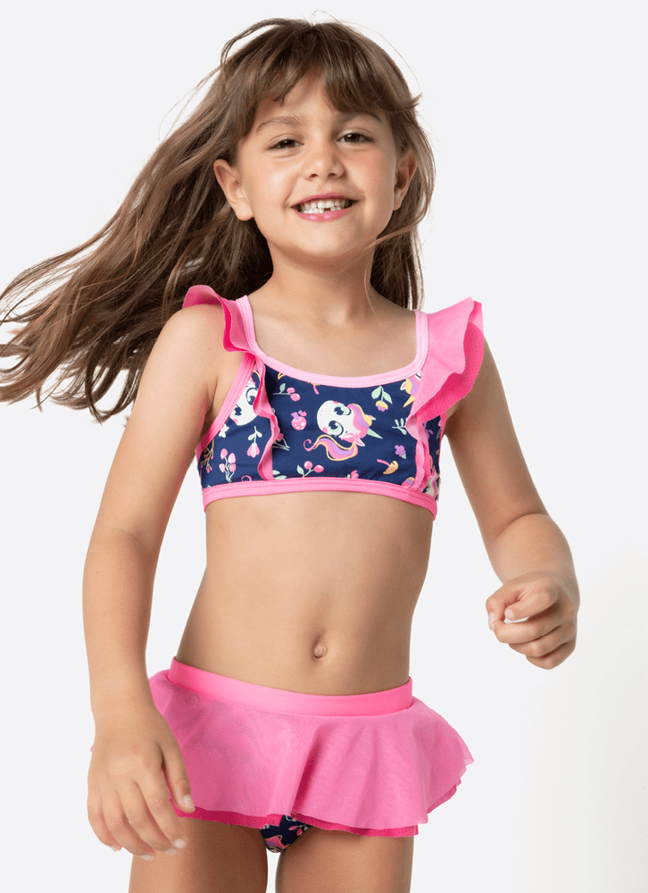 Descrição: Biquíni kids Uni. Possui estampa corrida, frente, alças e saia na calcinha com aplique de babados em tule.
