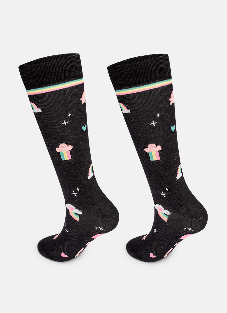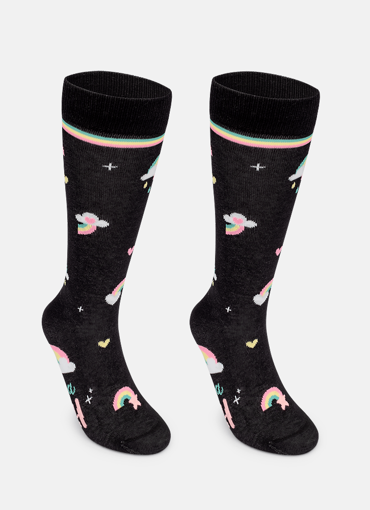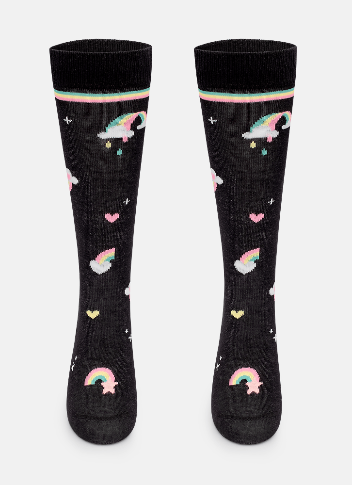 Meia 3/4 com desenho de arco-íris possui cano longo até o joelho, é produzida com algodão macio em sua maior parte e poliamida nos desenhos.