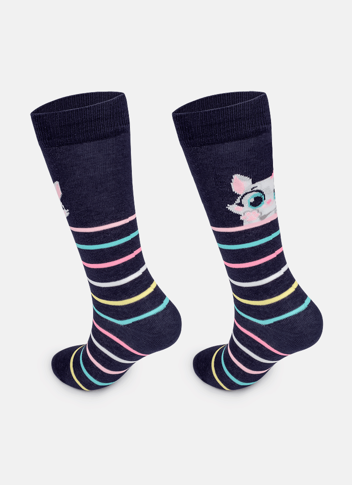 Meia 3/4 com desenho divertido de gata possui cano longo até o joelho, é produzida com algodão macio em sua maior parte e poliamida nos desenhos.