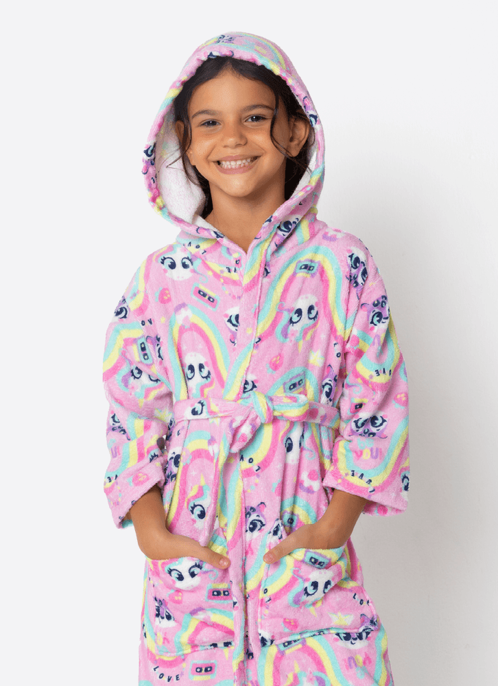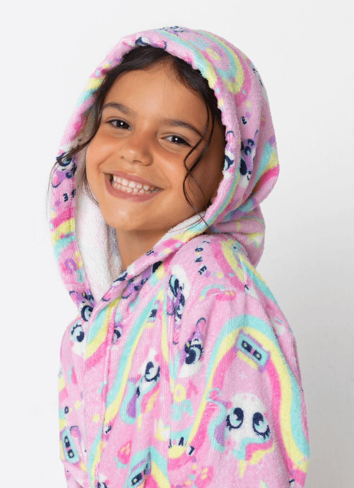 Roupão divertido com capuz, bolsos, amarração frontal e mangas 3/4 amplas. Ideal para os momentos pós banho, piscina, praia e brincadeiras com água.