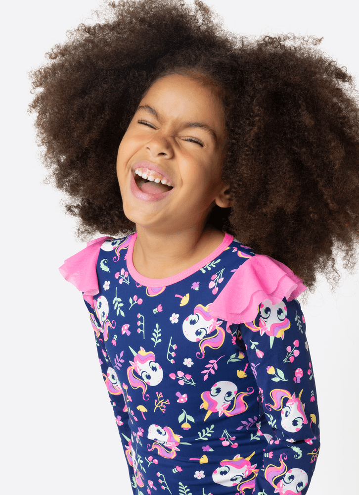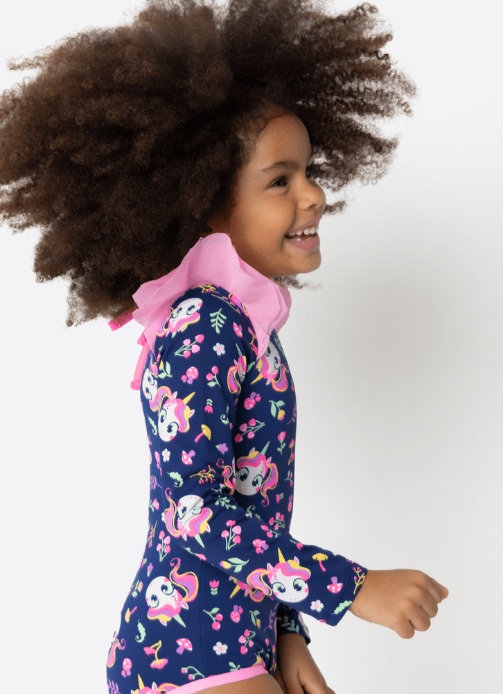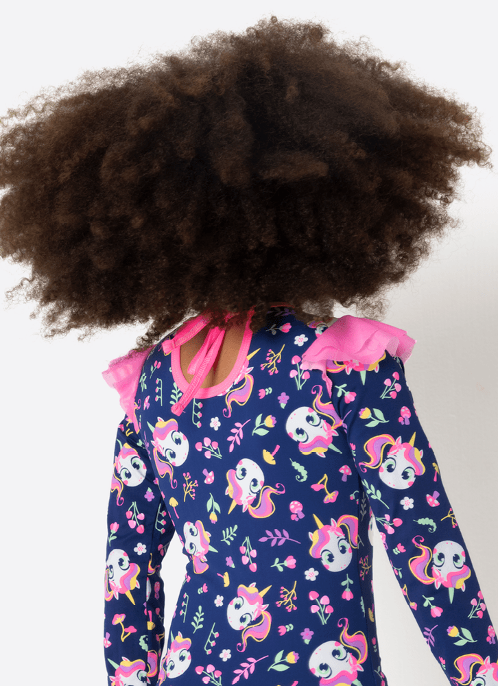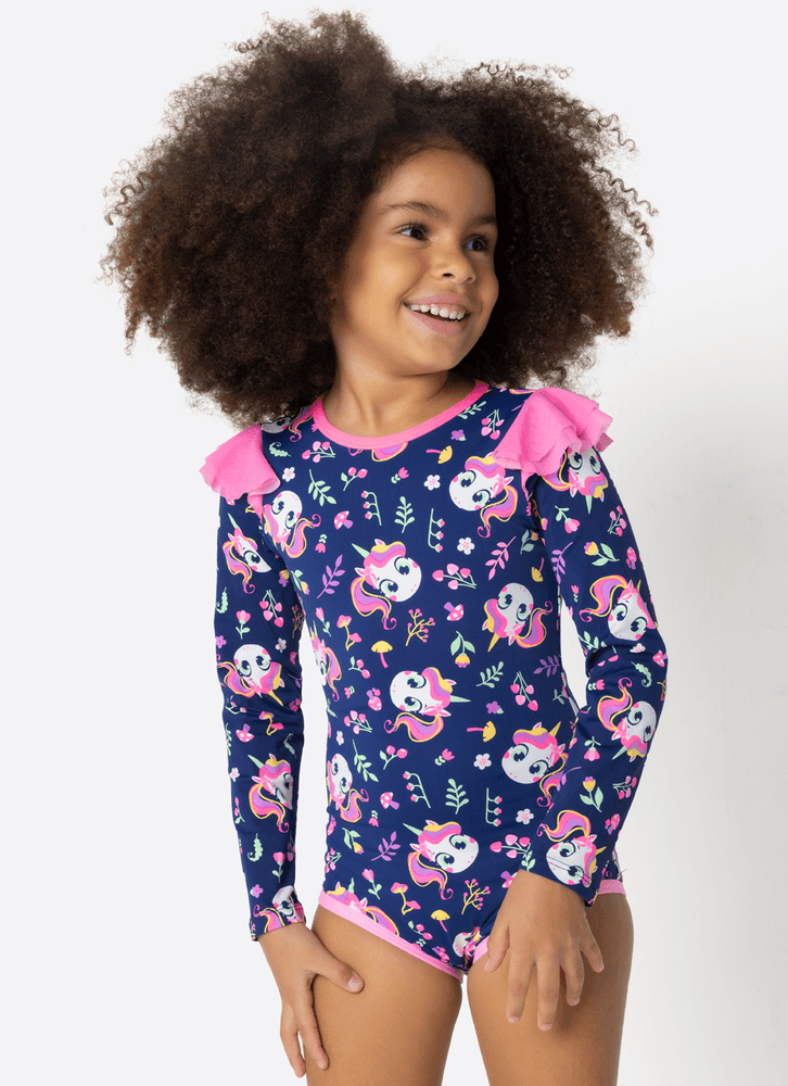 Descrição: maiô kids em estampa corrida. Possui abertura nas costas para ajuste, manga longa e aplique de babada em tule no ombro.