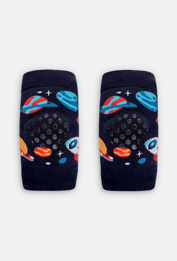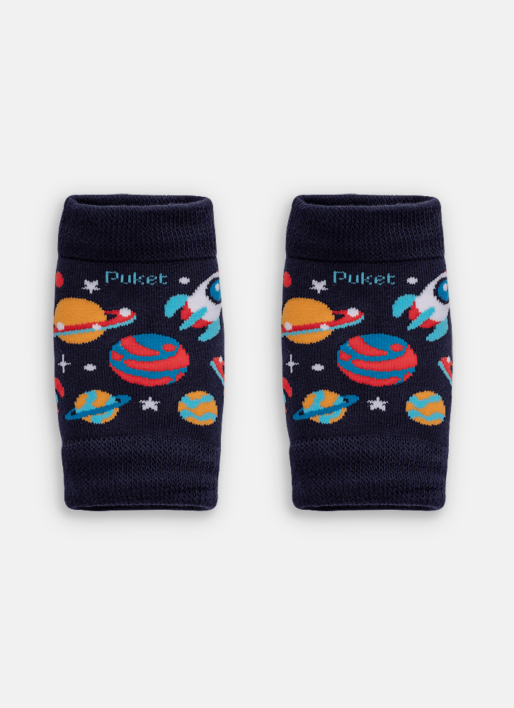 A Joelheira com desenho de planetas é produzida com algodão macio em sua maior parte, e poliamida no desenho.