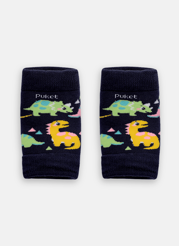 A Joelheira com desenho de dinossauros é produzida com algodão macio em sua maior parte, e poliamida no desenho.