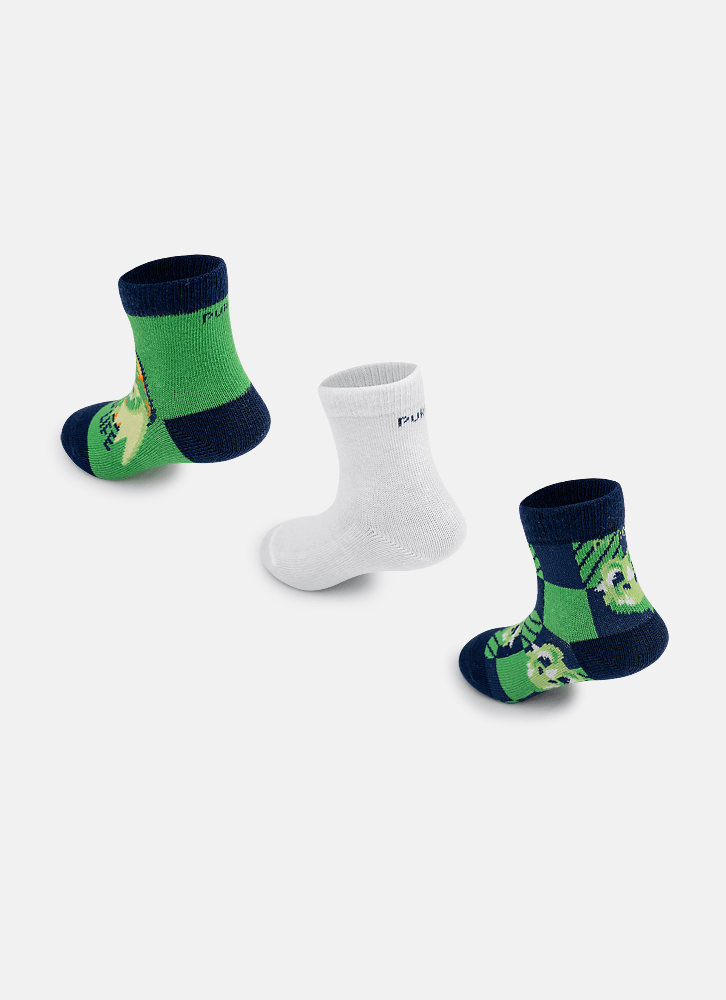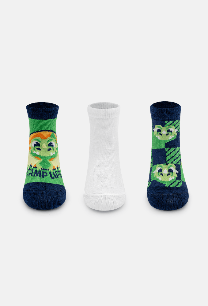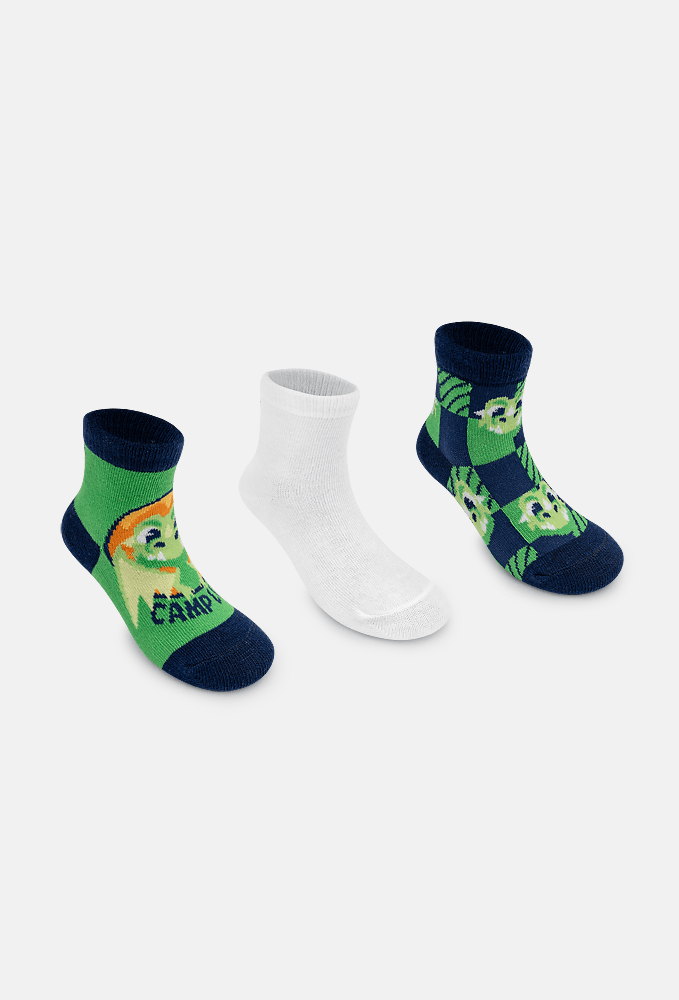 Kit com três pares de meias em algodão macio, sendo duas com desenhos divertidos de Dragão Camping e uma em cor lisa.