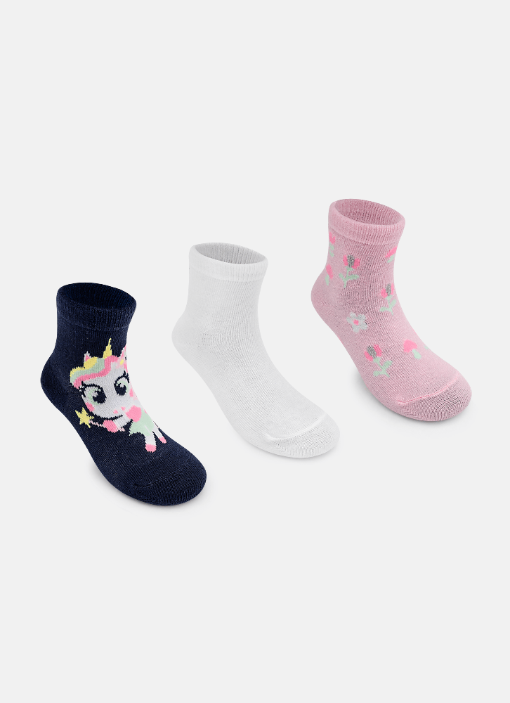 'Kit com três pares de meias em algodão macio, sendo duas com desenhos divertidos do tema Uni Floresta Encantada e uma em cor lisa.