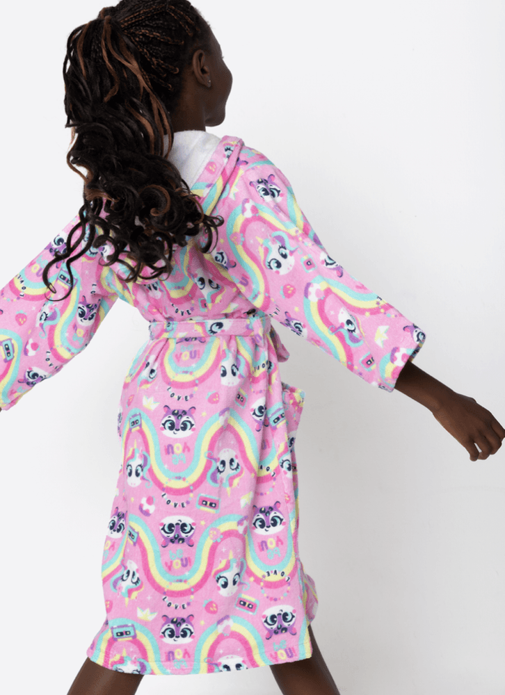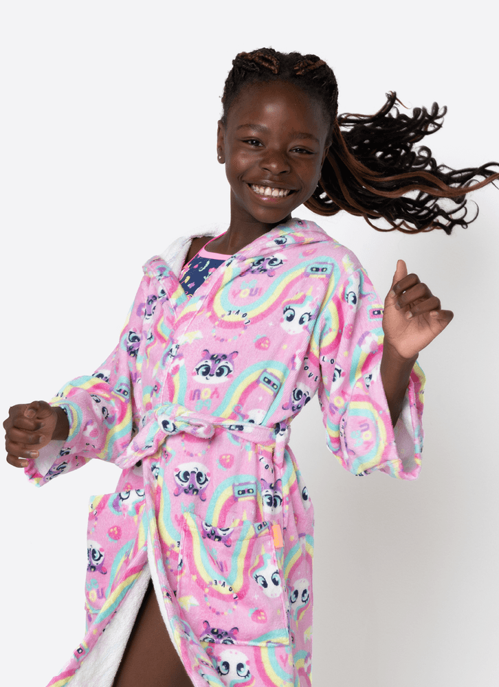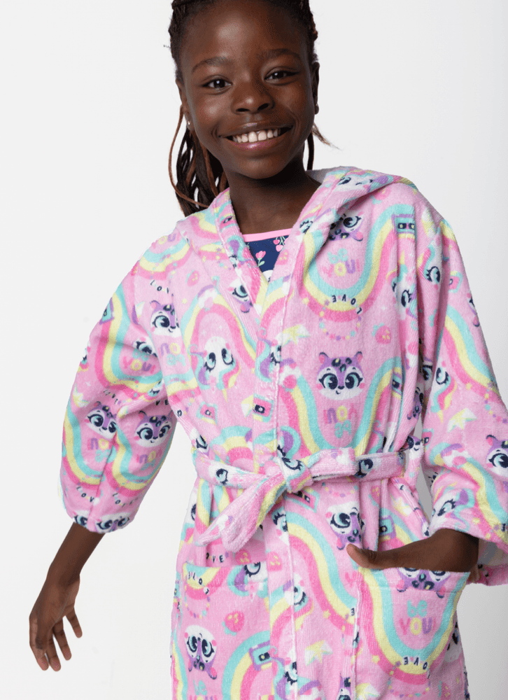 Roupão divertido com capuz, bolsos, amarração frontal e mangas 3/4 amplas. Ideal para os momentos pós banho, piscina, praia e brincadeiras com água.