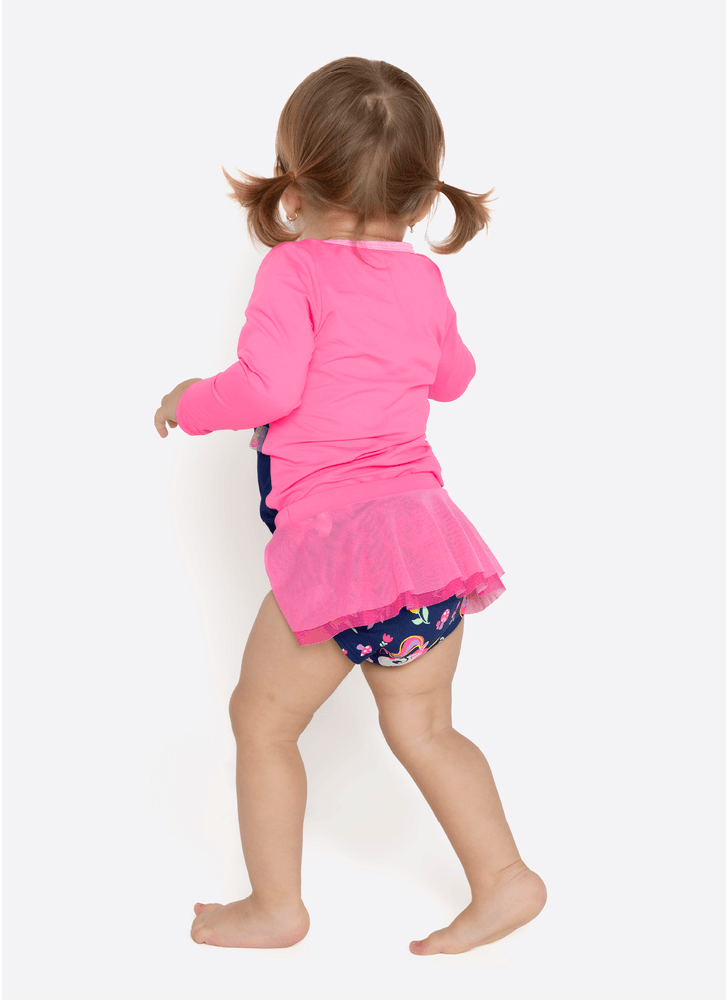 Descrição: conjunto baby. Possui camiseta manga longa com ombros expansíveis, estampa localizada em silk no top, estampa corrida na calcinha com aplique de babado em tule na lateral.
