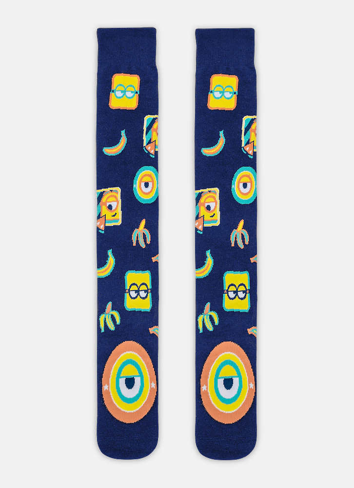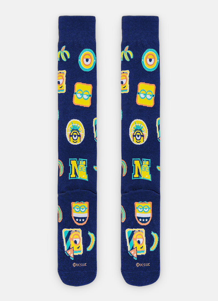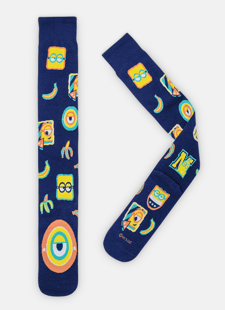 Meia 3/4 com desenho divertido dos Minions possui cano longo até o joelho, é produzida com algodão macio em sua maior parte e poliamida nos desenhos.