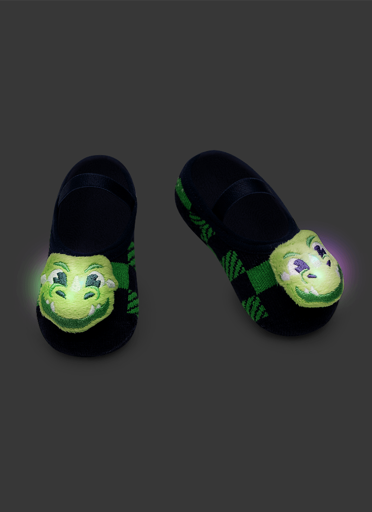 Meia sapatilha atoalhada, com desenho de Dragão Camping, e aplique fixo Led de Dragão.