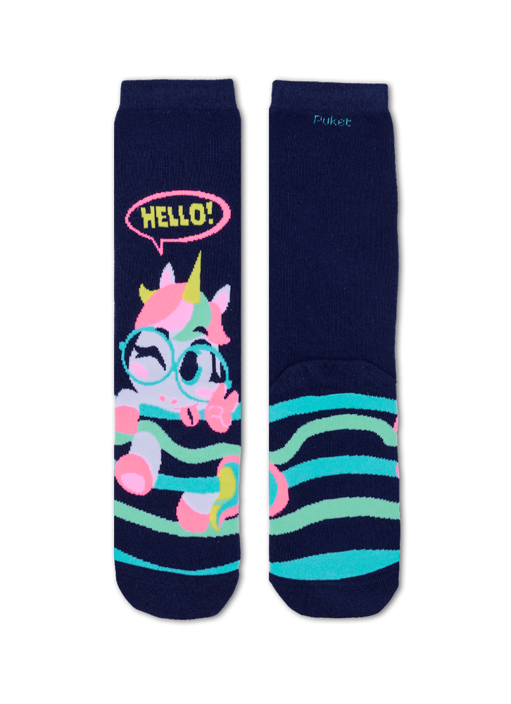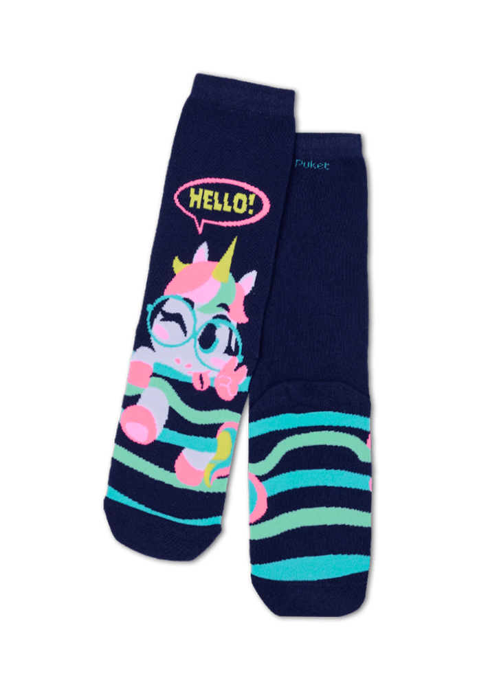 Meia de comprimento na metade da canela em algodão macio e desenho divertido de unicórnio em poliamida.