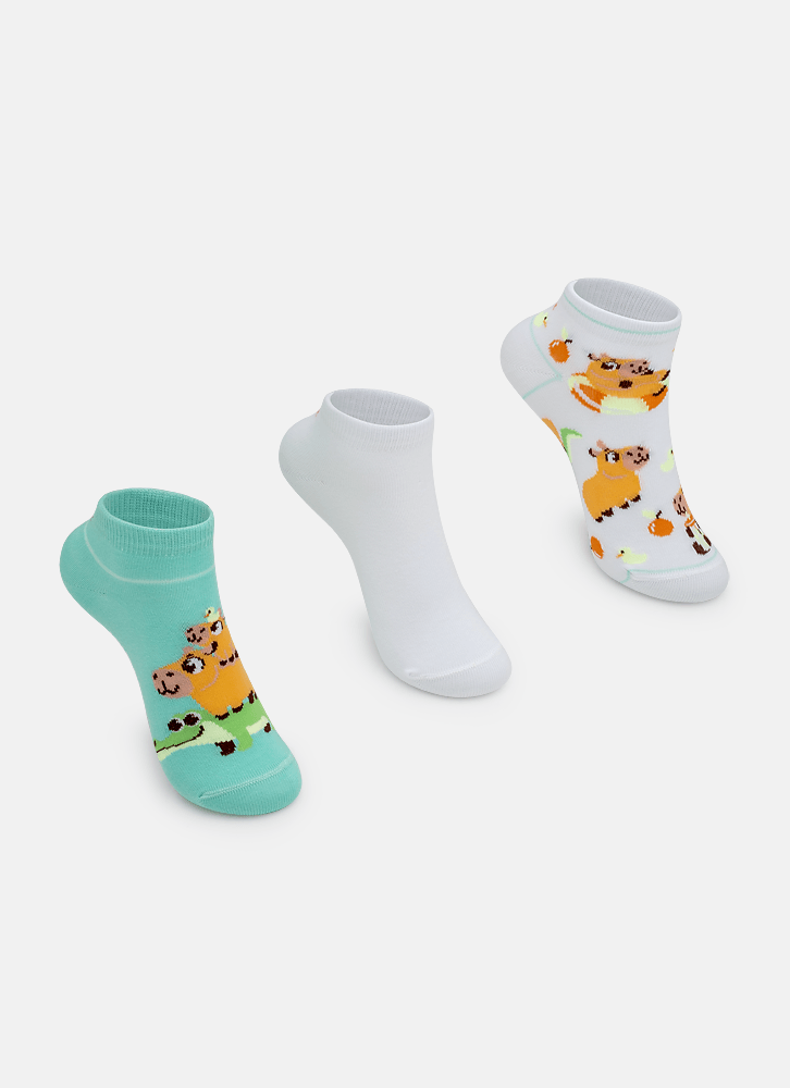 Kit com três pares de meias em algodão macio, sendo duas com desenhos divertidos de Capivara e uma em cor lisa.