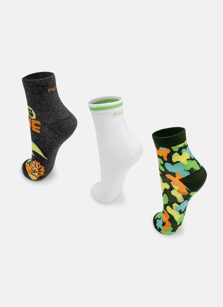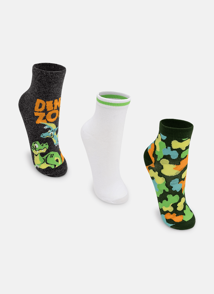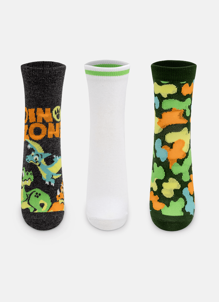 Kit com três pares de meias em algodão macio, sendo duas com desenhos divertidos de Dino Trio e uma em cor lisa com detalhe no punho.